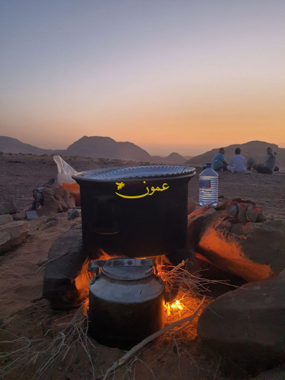 وبعد نصب خيامنا تقاسمنا الأدوار بجمع ما جفّ من حطب الغضا وطهي " المنسف " وهي أكْله أردنيه مدرجه ضمن قائمة التراث العالمي الإنساني بداية العام، وما أطيب أن يُطهى بقدر على نار حطب بيد ذواق ماهر، وتلاه ليلة سمر على شرف طبق من البطيخ من مزارع الديسي القريبه وهو الأطيب بمزارع المملكه قاطبة وكانت ضيافه من دليلنا، ومن المتعارف عليه بقواعد التخيم أن تكون جلسة المتسامرين بعيده عن الخيام حتى لا يعكروا صفو النائمين بصوتهم وكذلك وقت النهوض فلا صوت قبل ذلك فالطبيعه أم الهدوء ومدرسة التأمل والصفاء.