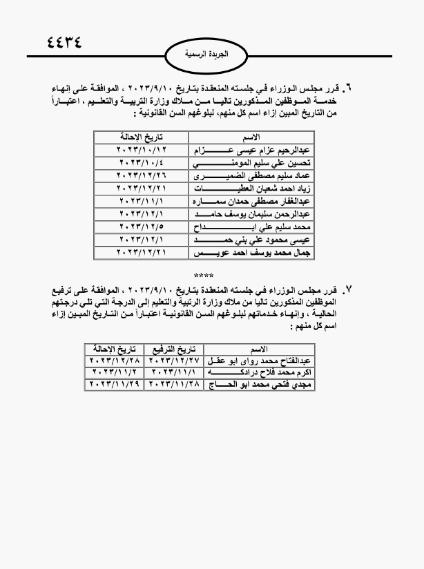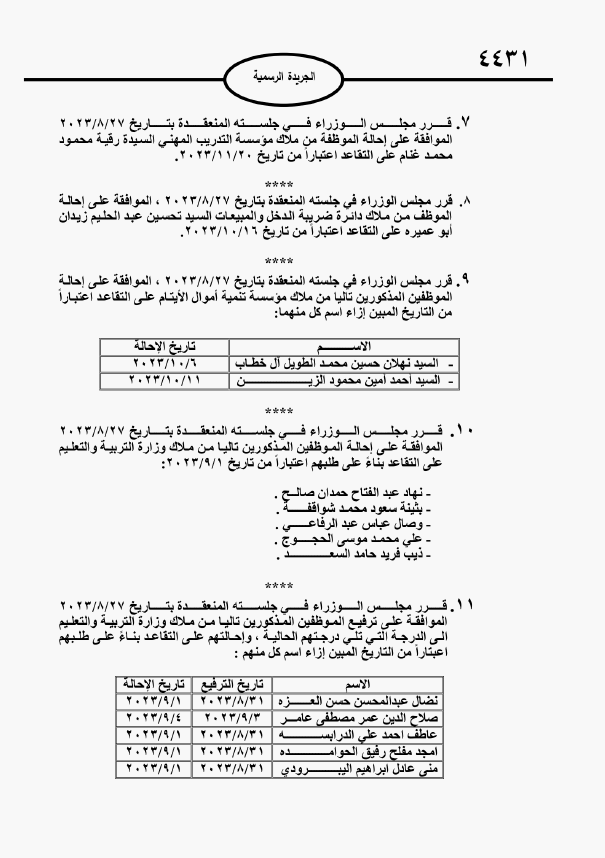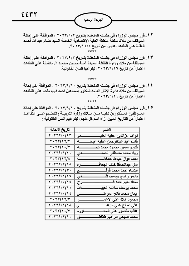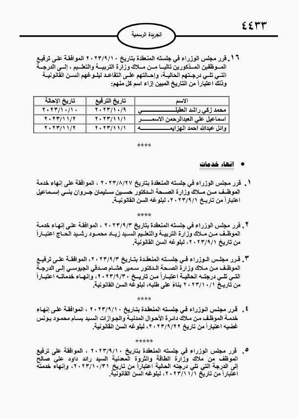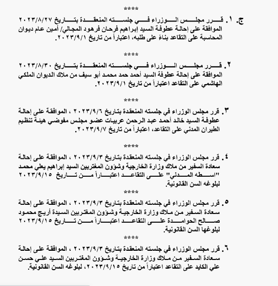 عمون - صدر في عدد الجريدة الرسمية اليوم الأحد قرارات مجلس الوزراء بالموافقة على إحالة عدد من الموظفين الحكوميين إلى التقاعد، وإنهاء خدمات آخرين.