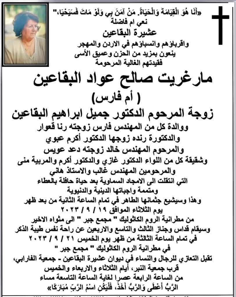 عمون - عشيرة البقاعين، وأقرباؤهم وأنسباؤهم في الأردن والمهجر، ينعون بمزيد من الحزن وعميق الأسى، فقيدتهم الغالية المرحومة، مارغريت صالح عواد البقاعين (أم فارس) زوجة المرحوم الدكتور جميل ابراهيم البقاعين.