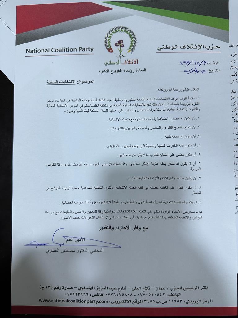 عمون - خاطب أمين عام حزب الائتلاف الوطني، الدكتور مصطفى العماوي، رؤساء الفروع التابعة للحزب، بترشيح الأسماء الراغبة للترشح في الانتخابات النيابية القادمة عن الحزب نفسه والدائرة الانتخابية.