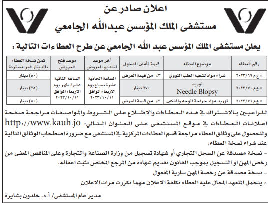 عطاءات صادرة عن مستشفى الملك المؤسس عبدالله الجامعي