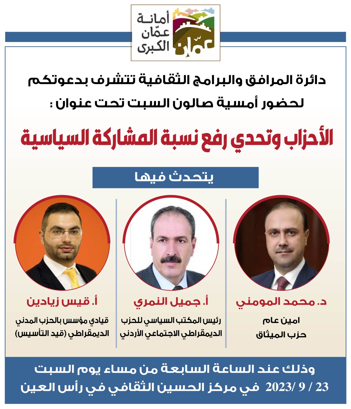 عمون - يناقش قادة حزبيون عند السابعة من مساء غد السبت في مركز الحسين الثقافي في رأس العين دور الأحزاب الأردنية في الحياة السياسية وتحدي رفع نسبة المشاركة السياسية. |