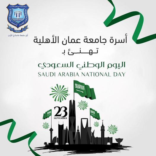 عمون - أسرة جامعة عمان الأهلية ممثلة برئيس وأعضاء مجلس الأمناء ورئيس وأعضاء هيئة المديرين ورئيس الجامعة وأعضاء الهيئتين التدريسية والادارية وطلبة الجامعة يتقدمون بأحر التهاني من المملكة العربية السعودية والشعب السعودي الشقيق بمناسبة اليوم الوطني الثالث والتسعين. |
