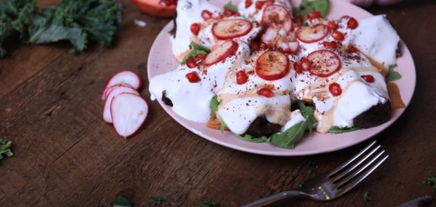 7. ضع الباذنجان في وعاء التقديم وصب صلصة الزبادي فوقها.