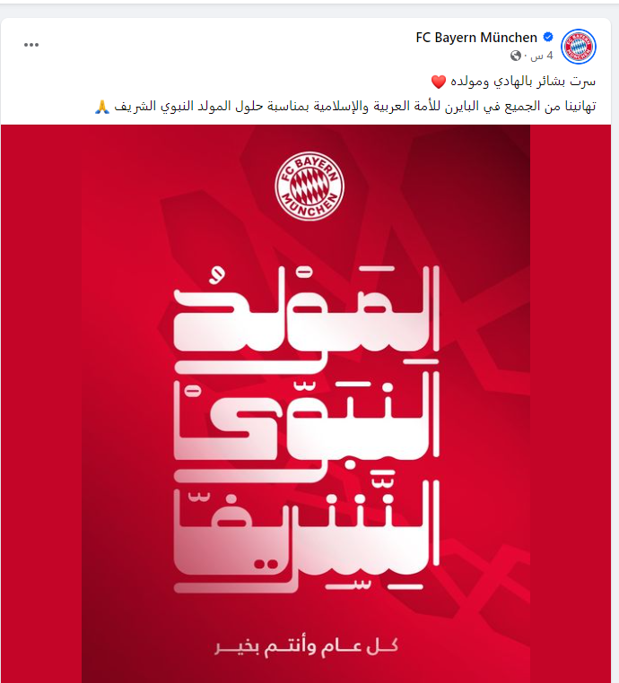 بايرن ميونخ يهنئ المسلمين بعيد المولد النبوي الشريف27-09-2023 08:12 PM
