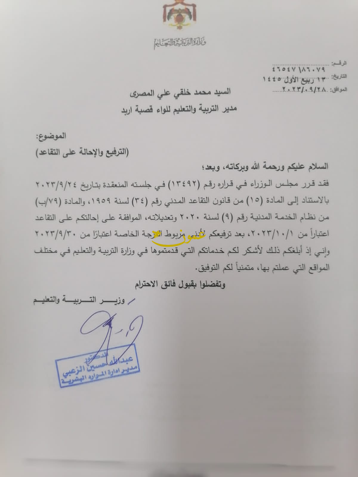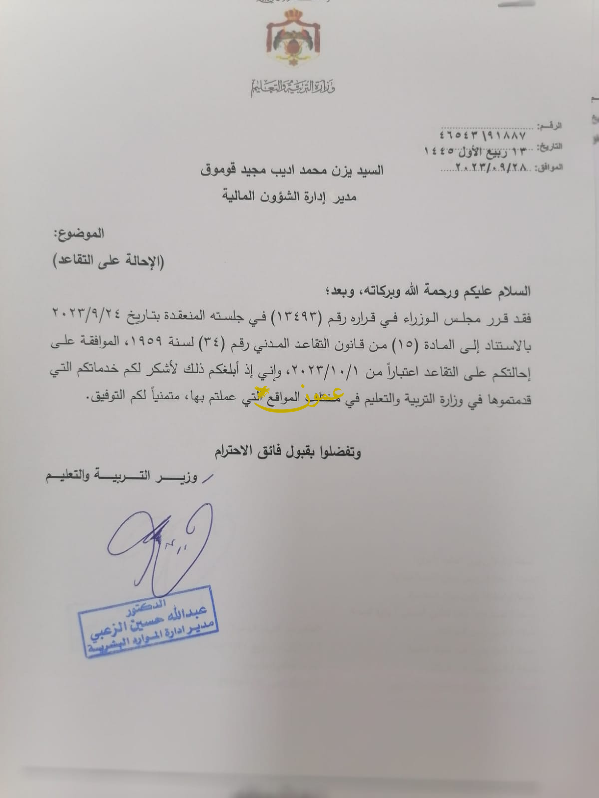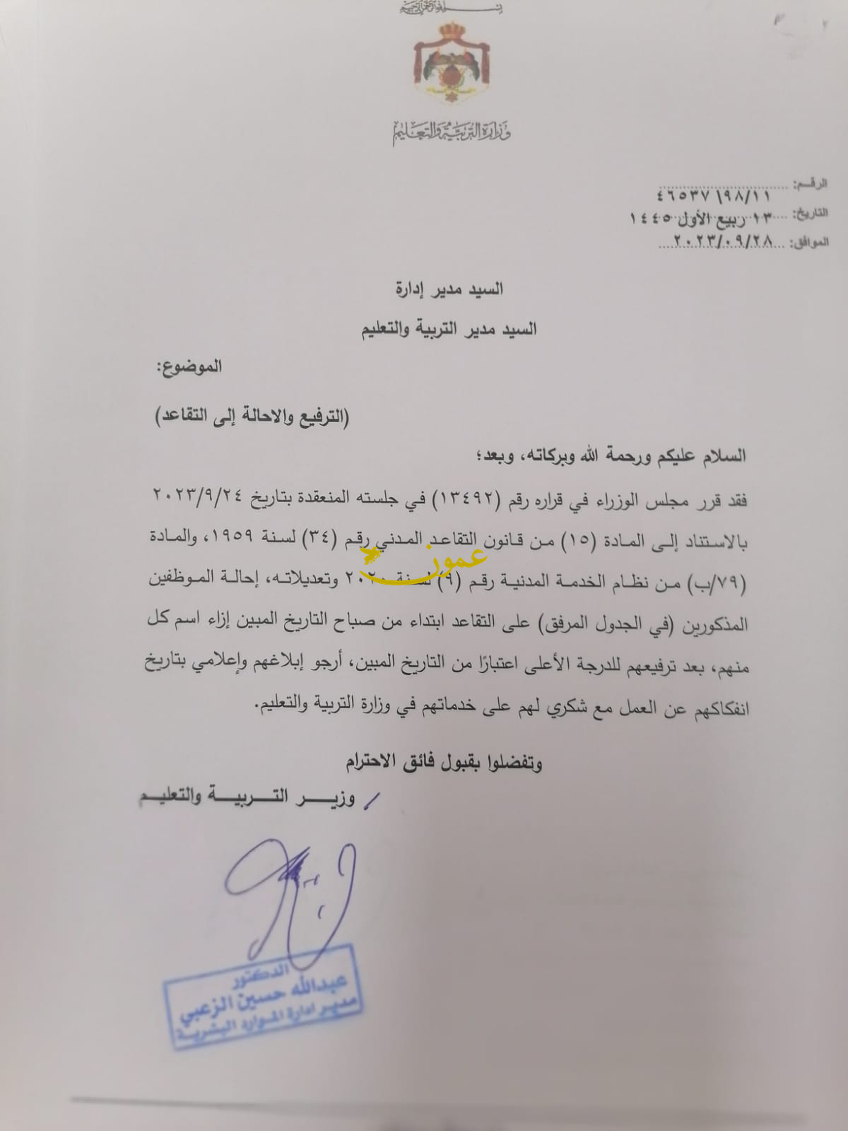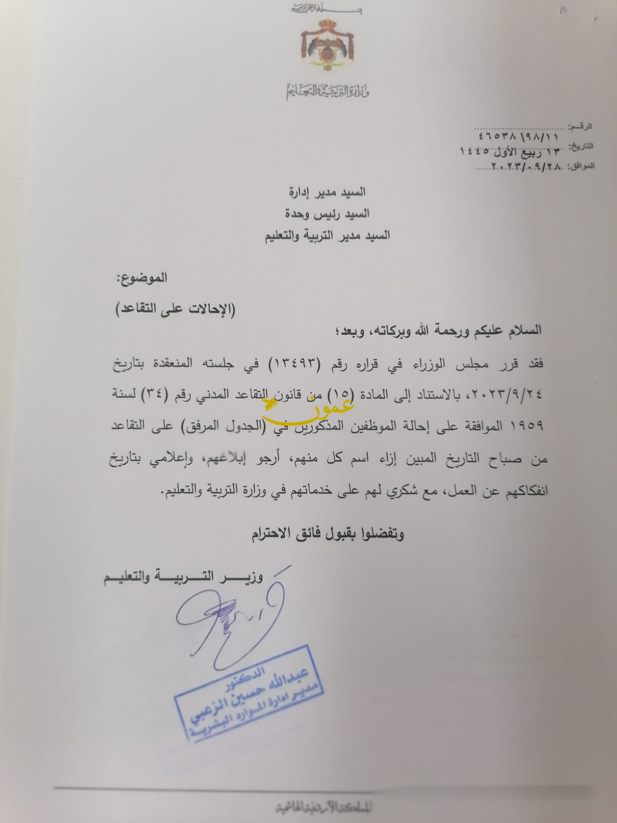 عمون - ينال المعاني - قرر مجلس الوزراء إحالة موظفين في وزارة التربية والتعليم إلى التقاعد.
