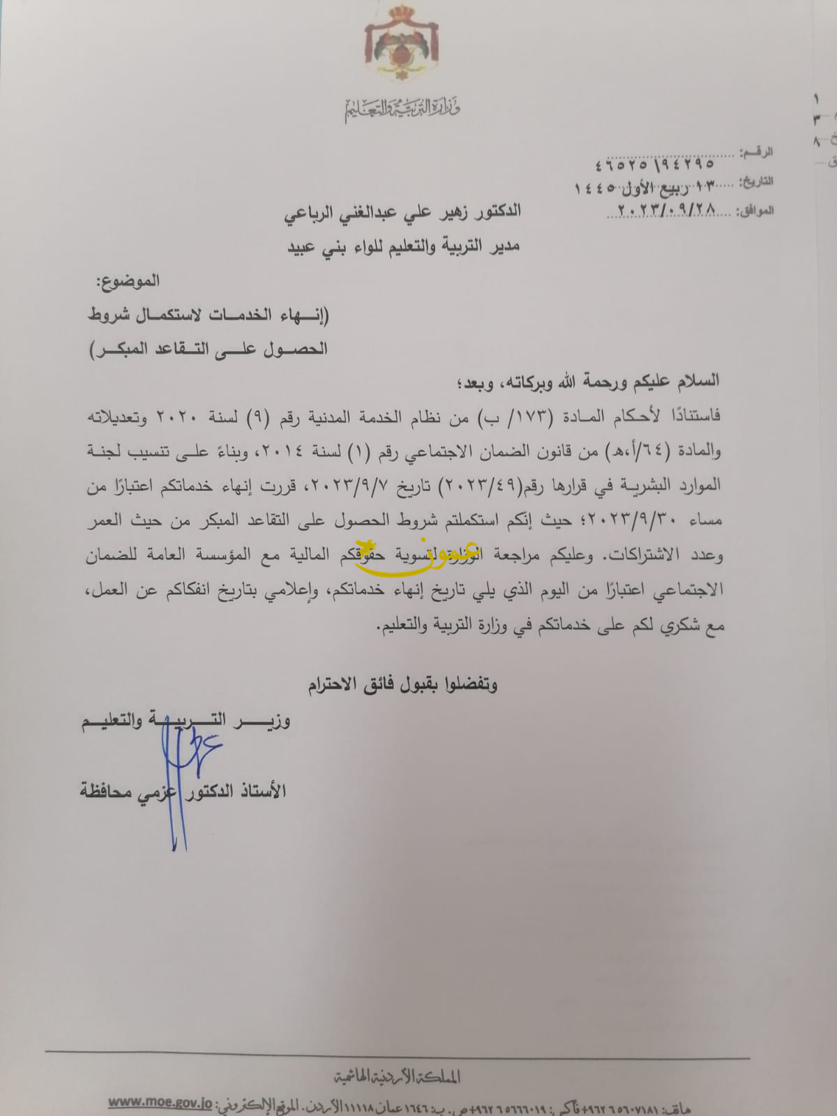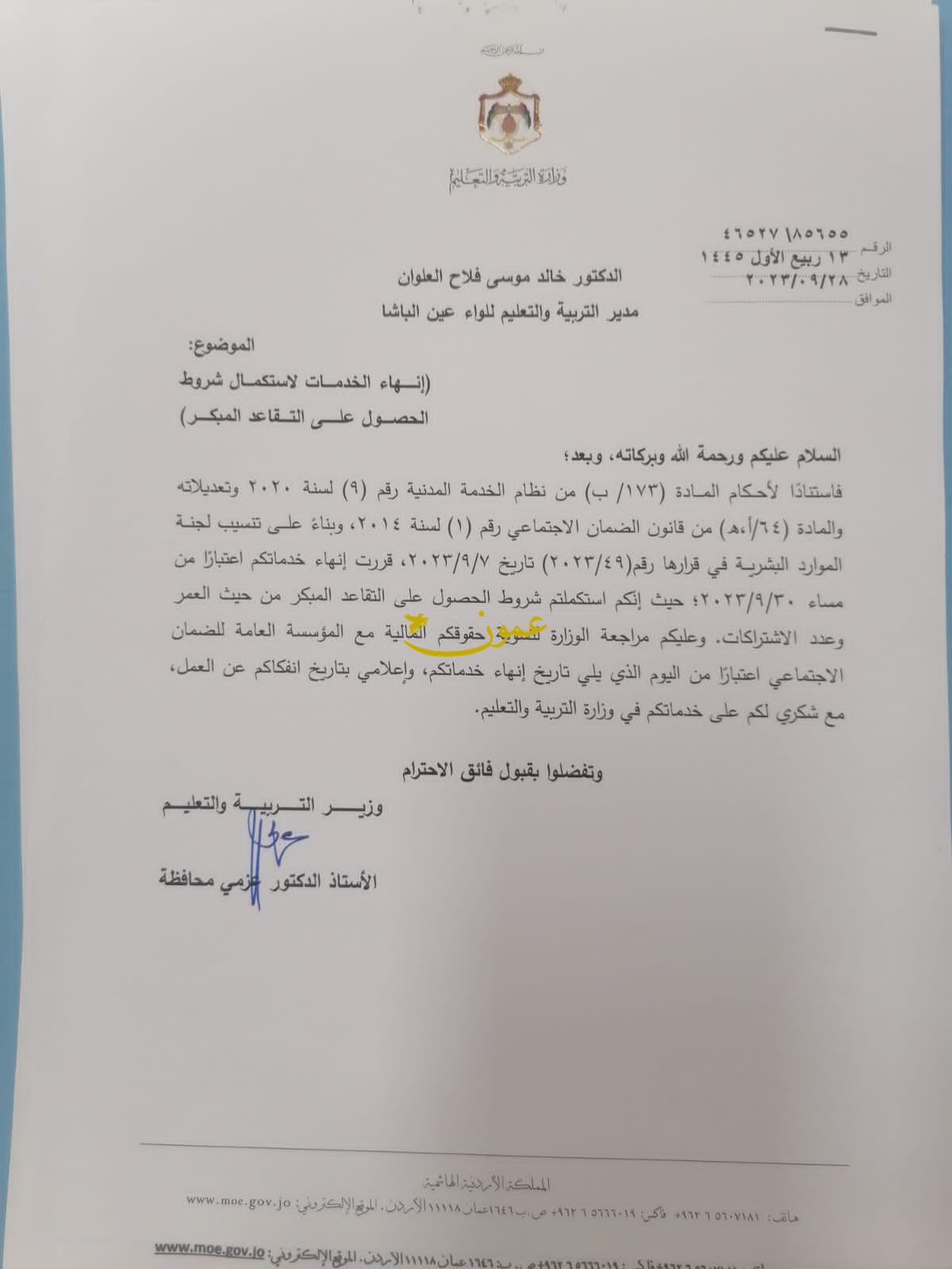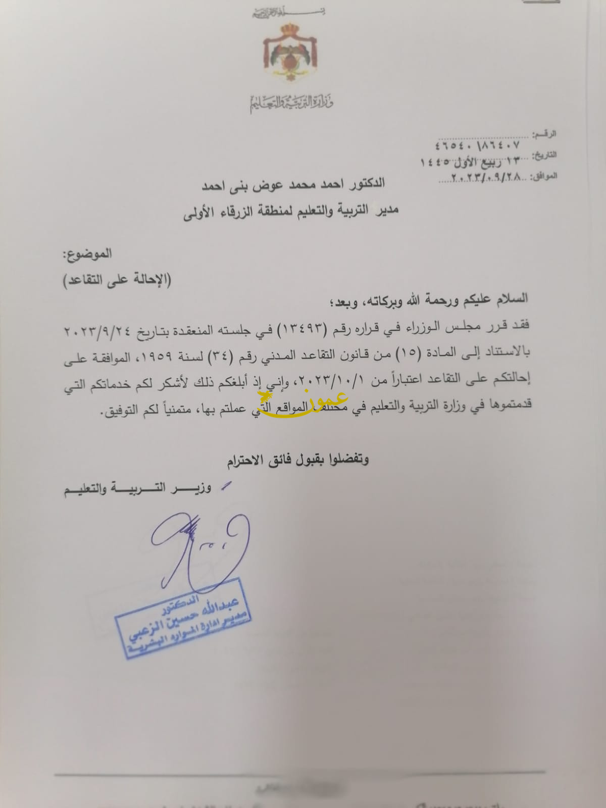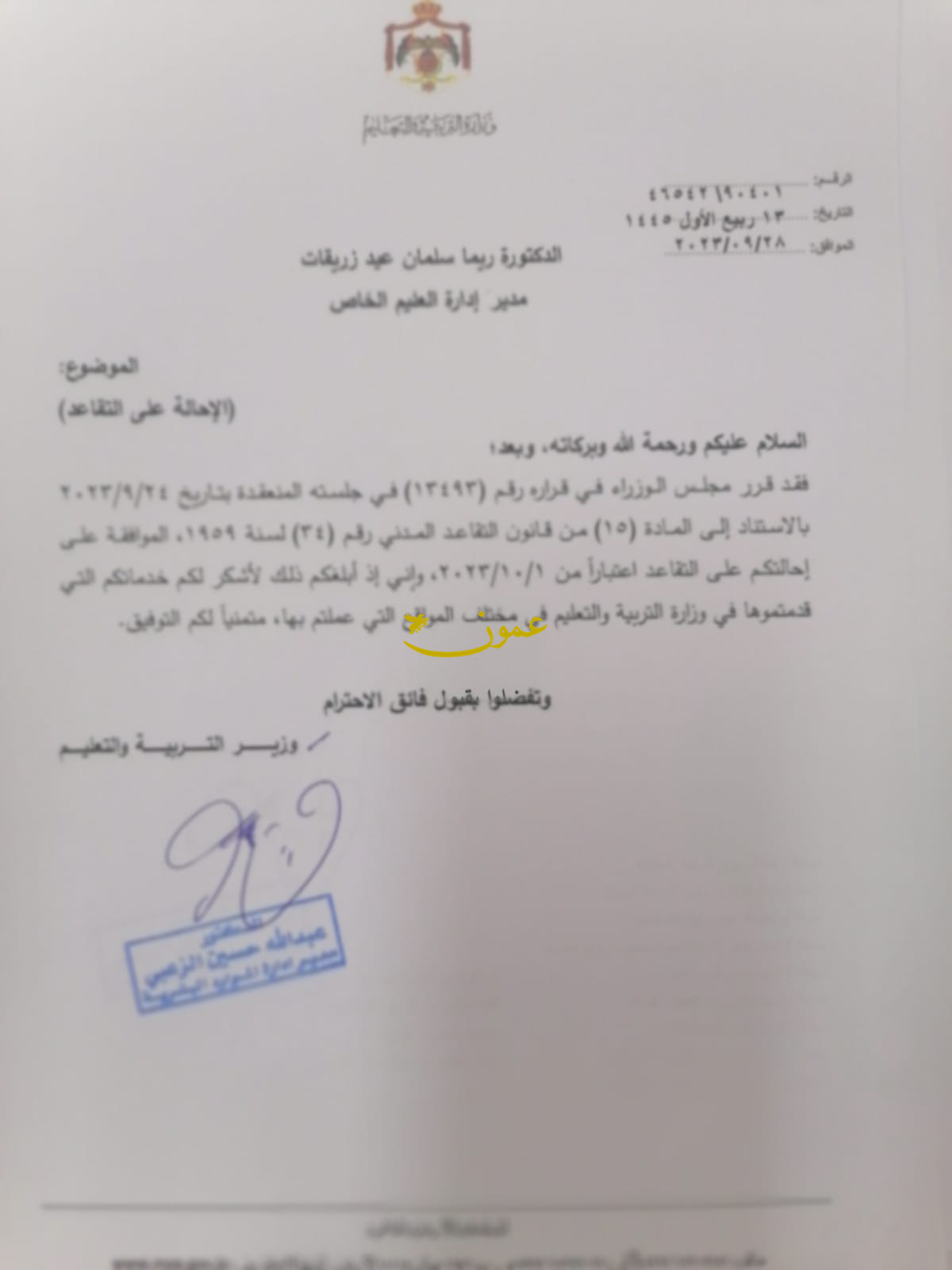 عمون - ينال المعاني - قرر مجلس الوزراء إحالة موظفين في وزارة التربية والتعليم إلى التقاعد.