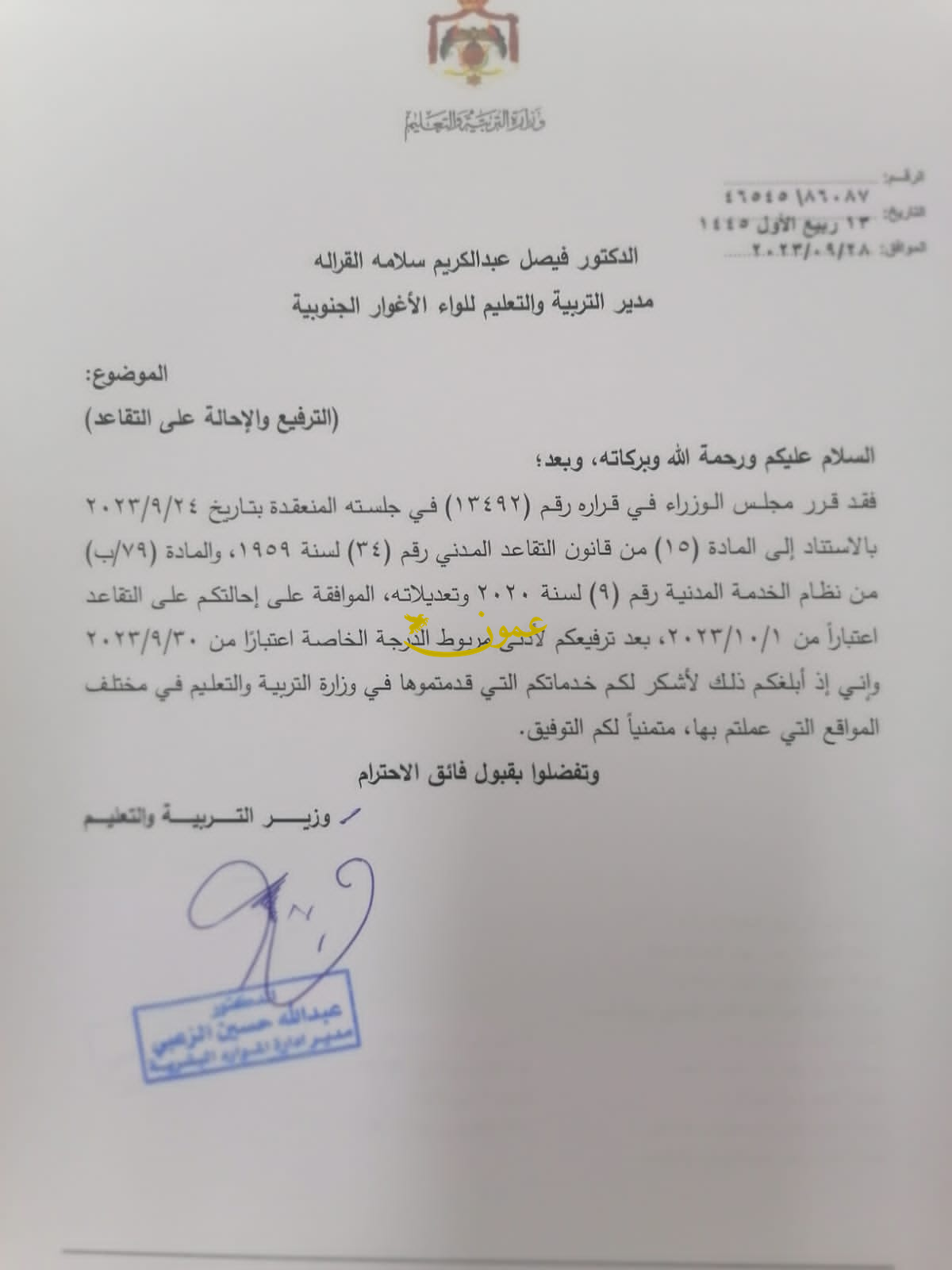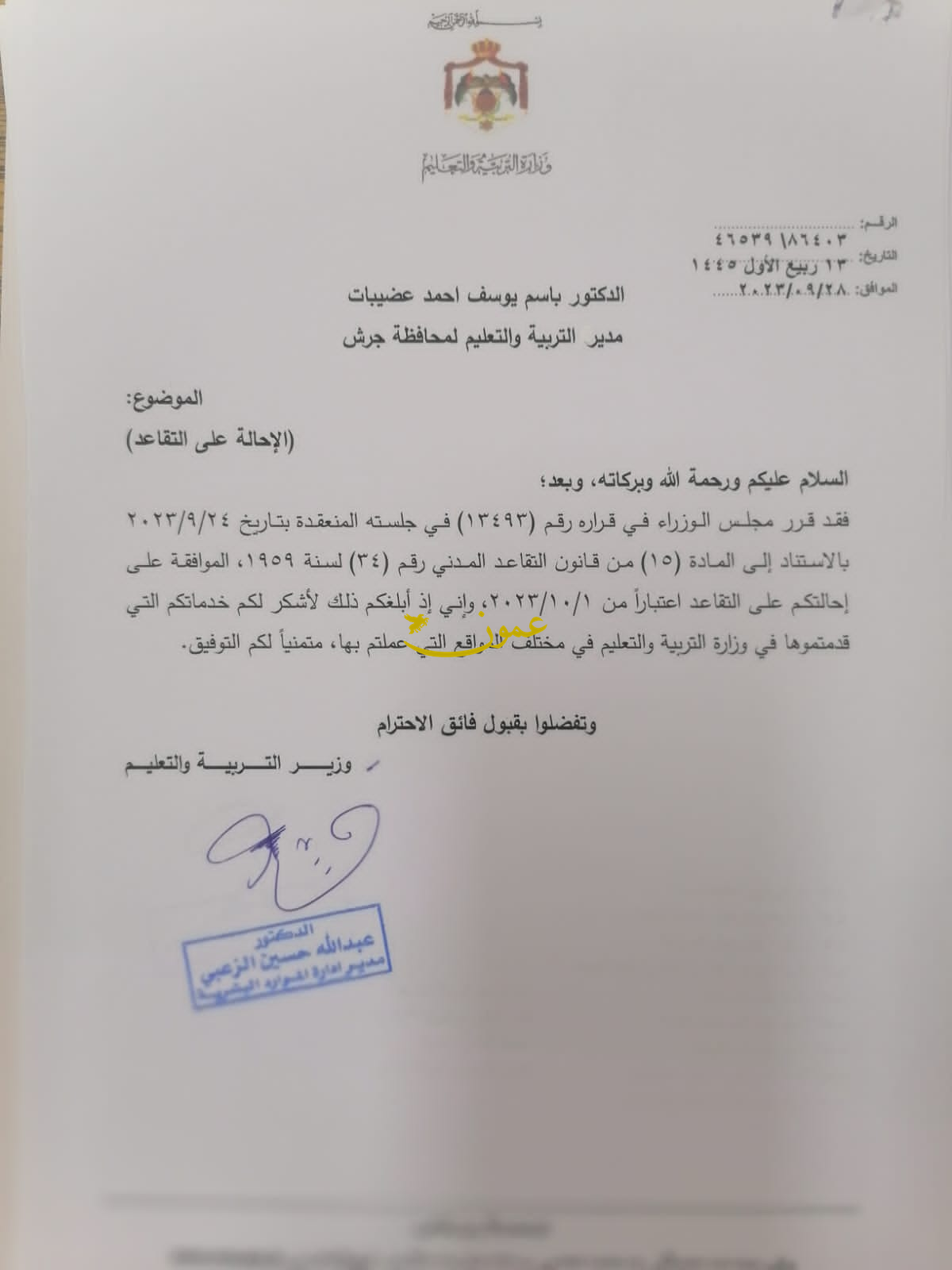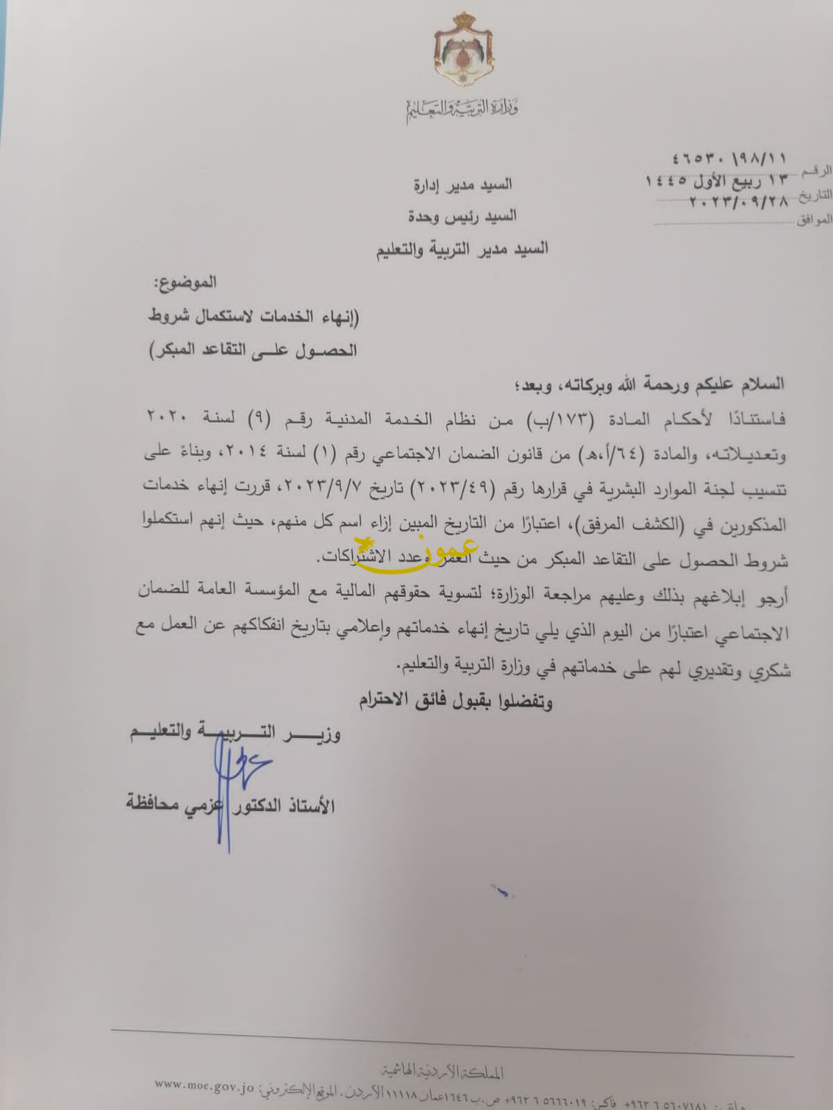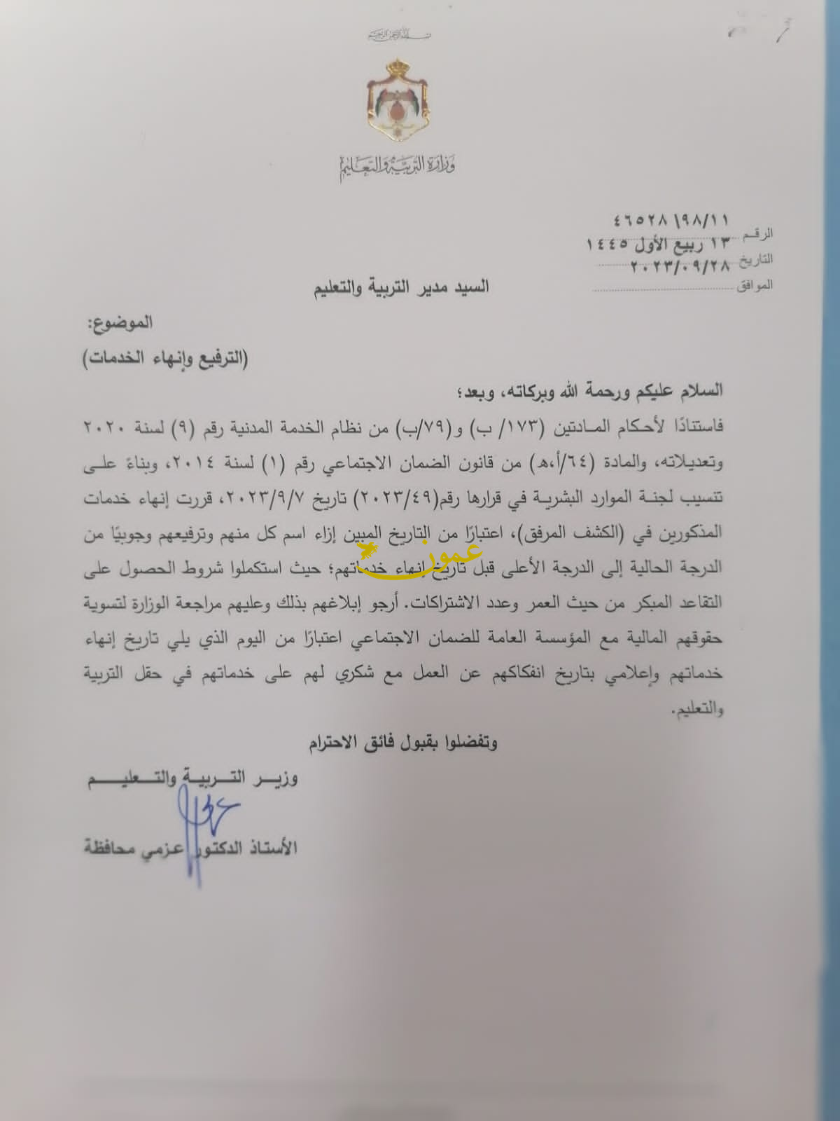 عمون - ينال المعاني - قرر مجلس الوزراء إحالة موظفين في وزارة التربية والتعليم إلى التقاعد.
