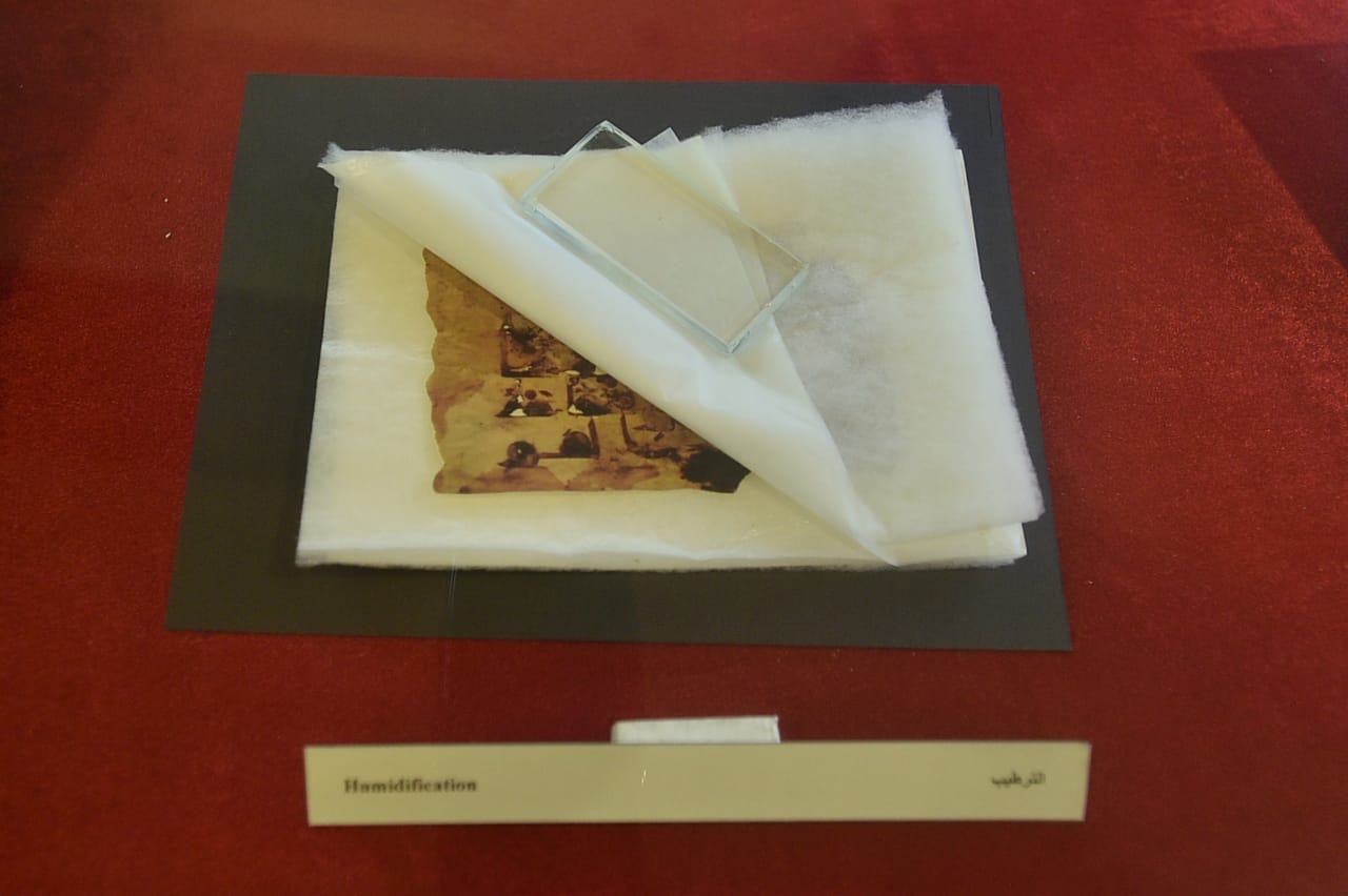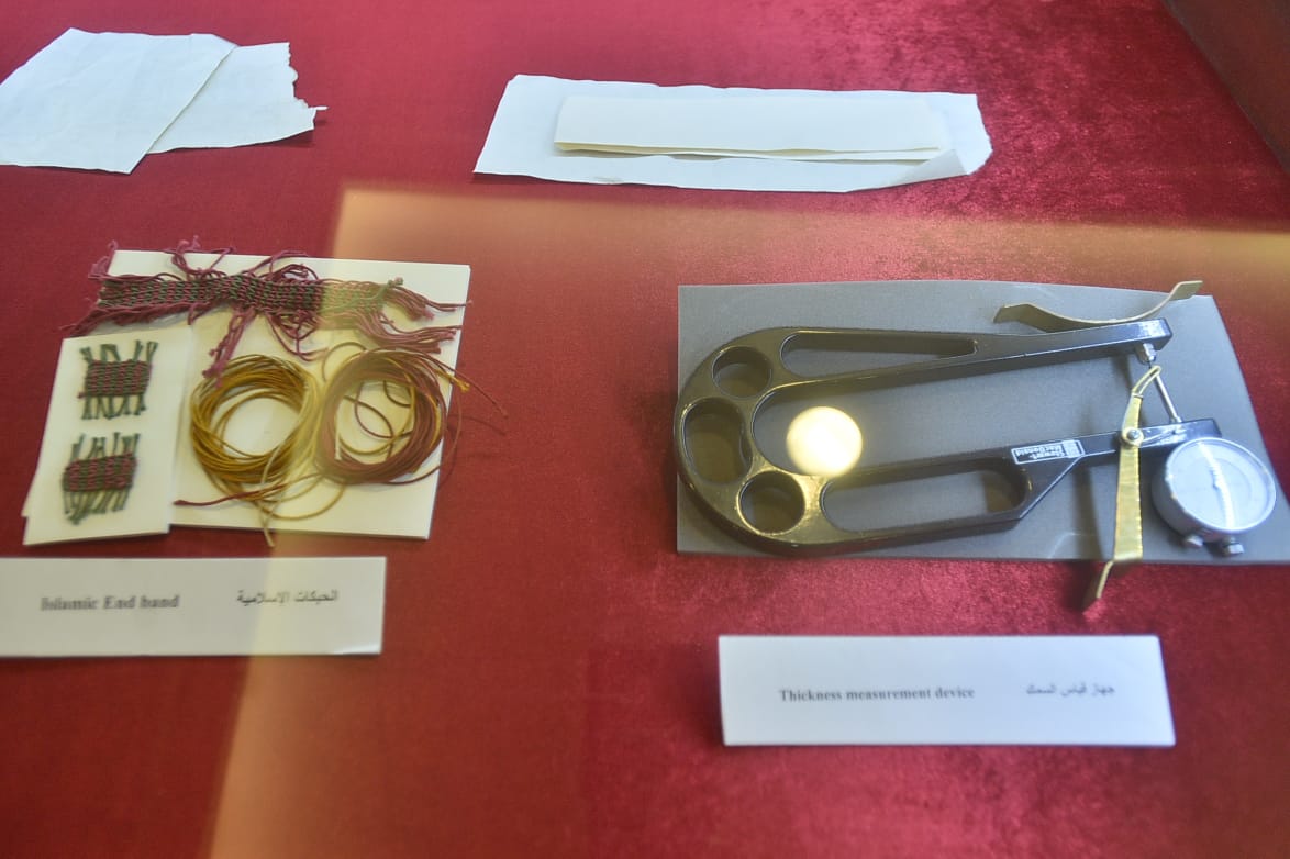 وتظهر الصور المصحف الأصلي بالخط الحجازي، وبجانبه مصحف مستنسخ بخط النسخ، وكذلك الأدوات المختلفة التي تم استخدامها في عملية الترميم من أحبار وأوراق الرف.