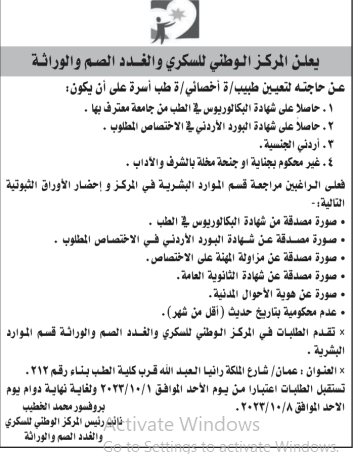 وظيفة شاغرة لدى المركز الوطني للسكري والغدد الصم والوراثة