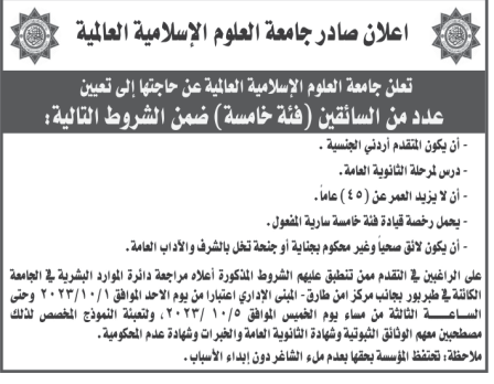 مطلوب سائقين للعمل لدى جامعة العلوم الاسلامية العالمية