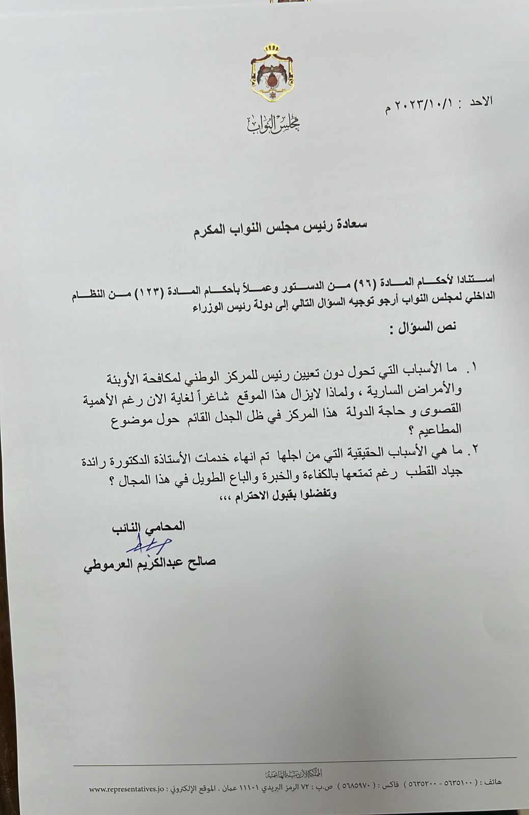 العرموطي يسأل عن إنهاء خدمة القطب وشغور رئاسة الوطني للأوبئة01-10-2023 01:04 PM