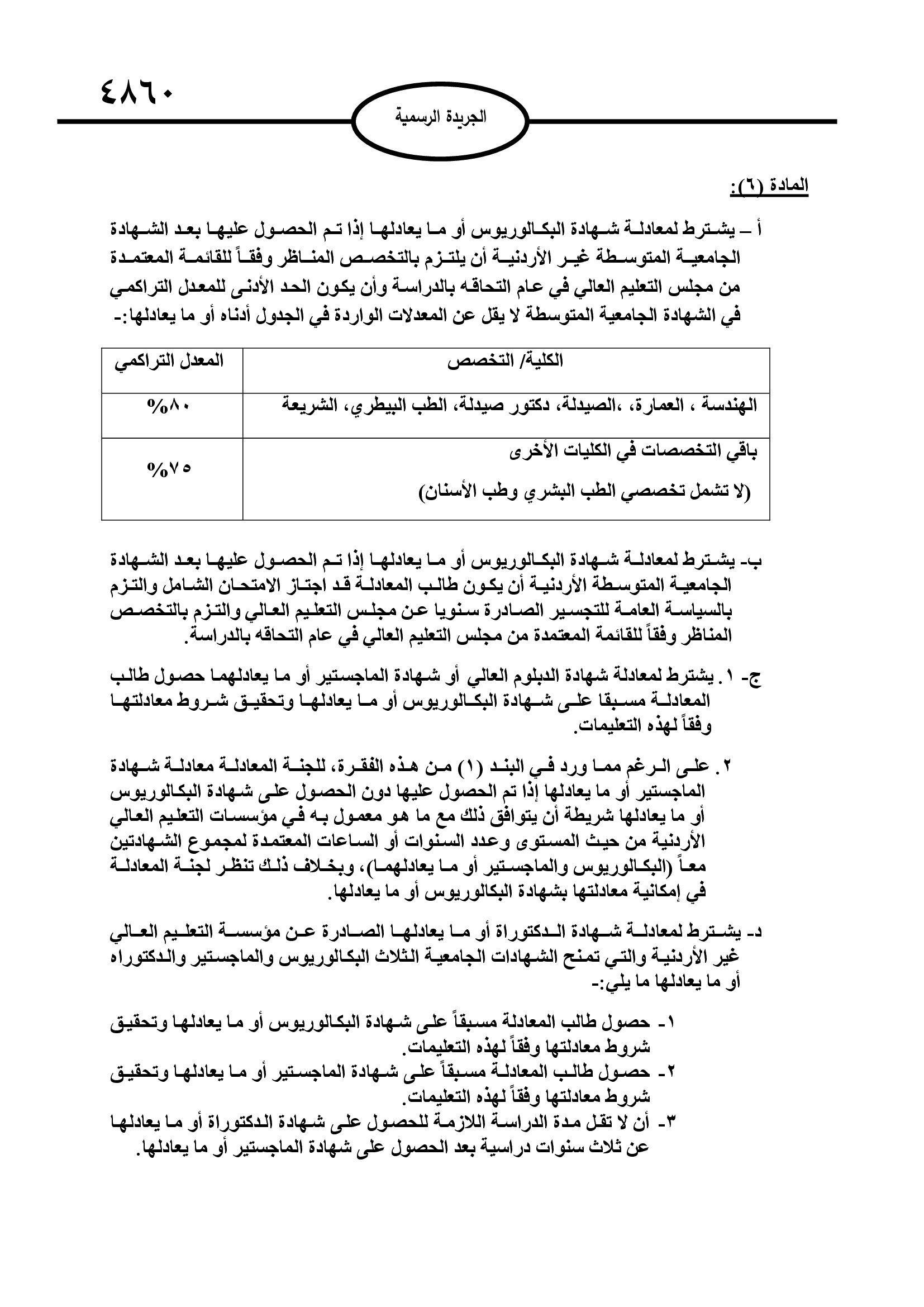 واشترطت التعليمات لمعادلة شهادة البكالوريوس أو ما يعادلها إذا تم الحصول عليها بعد الشهادة الجامعية المتوسطة غير الأردنية أن يلتزم بالتخصص المناظر وفقاً للقائمة المعتمدة من مجلس التعليم العالي في عام التحاقه بالدراسة.