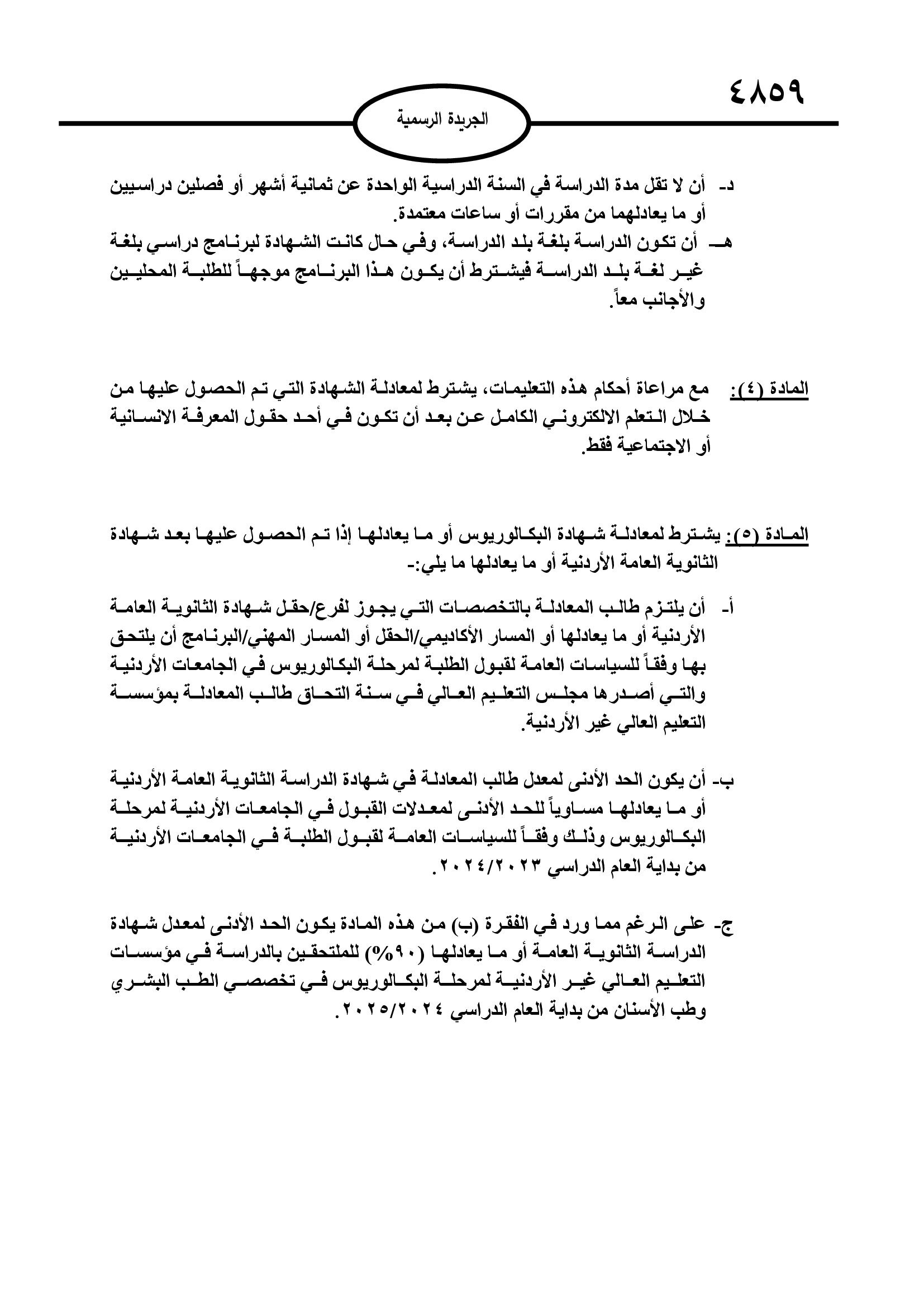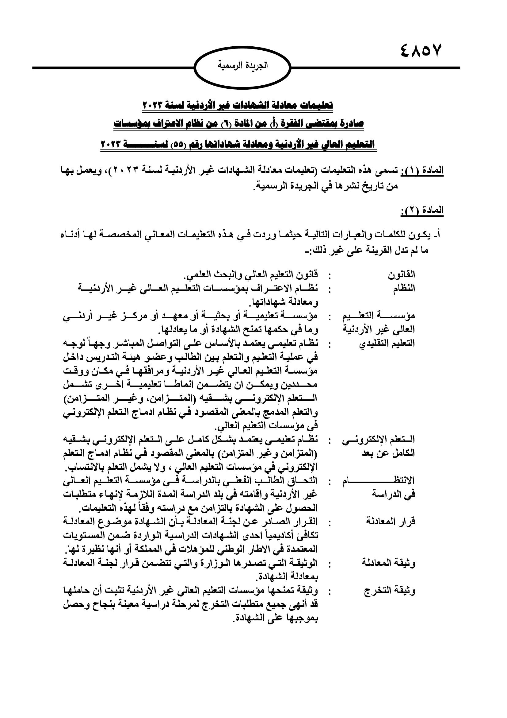 عمون - صدر في عدد الجريدة الرسمية الصادر اليوم الأحد، تعليمات معادلة الشهادات غير الأردنية لسنة ٢٠٢٣.