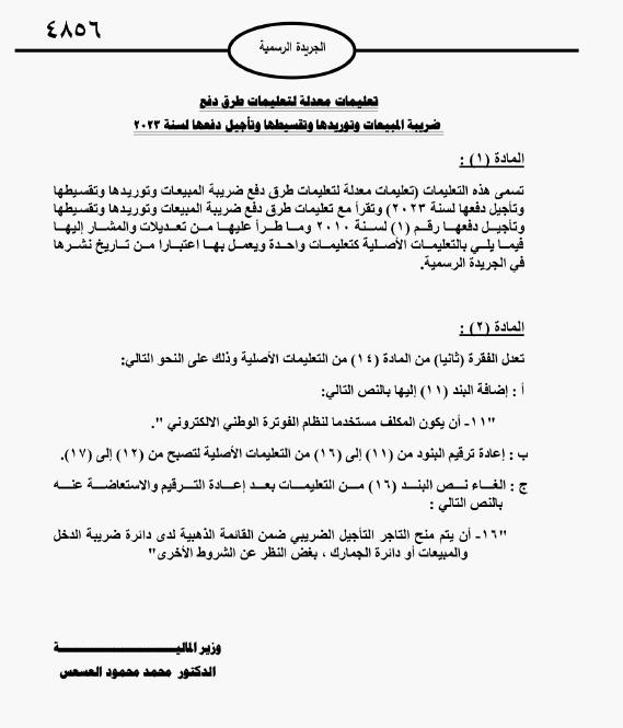 عمون - عدل وزير المالية، الدكتور محمد العسعس، على تعليمات طرق دفع ضريبة المبيعات وتوريدها وتقسيطها، وفقًا لعدد الجريدة الرسمية الصادر اليوم الأحد.