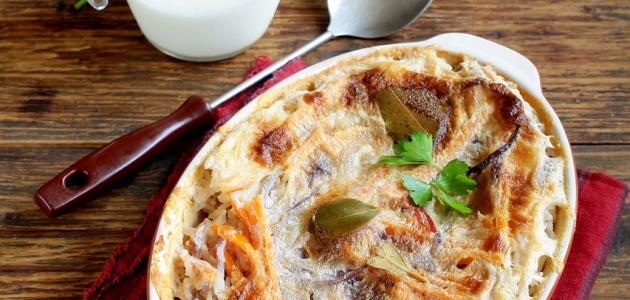 3. تصفية الأرز ووضع ثلثه في الطاجن، ثم إضافة الكفتة والصلصة والباقي من الأرز. ثم سكب الحليب والمرقة.