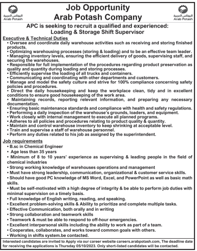 وظيفة شاغرة لدى شركة البوتاس العربية
