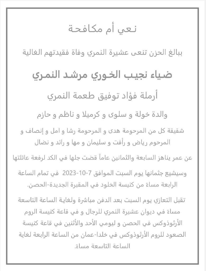 عمون - ببالغ الحزن، تنعى عشيرة النمري وفاة فقيدتهم الغالية، ضياء نجيب الخوري مرشد النمري، أرملة فؤاد توفيق طعمة النمري، والدة خولة وسلوى وكرميلا وناظم وحازم.