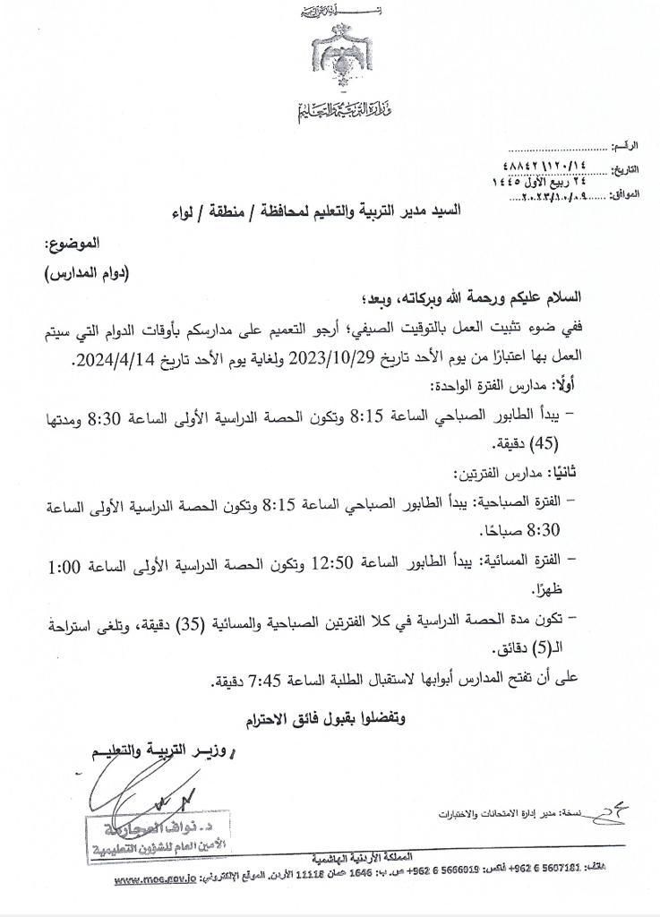 عمون - عمم أمين عام وزارة التربية والتعليم الدكتور نواف العجارمة، على مدراء التربية والتعليم في المحافظات والمناطق والالوية، بتحديد أوقات دوام المدارس بدءا من تاريخ 29/10/2023 وحتى 14/4/2024، في ضوء تثبيت العمل بالتوقيت الصيفي. |