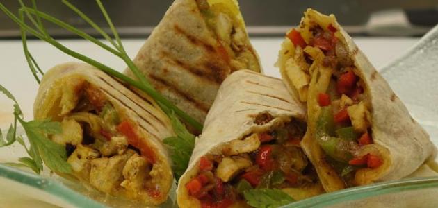 6. نقوم بوضع شرائح الدجاج على الخبز ونلفها على شكل أسطوانة.