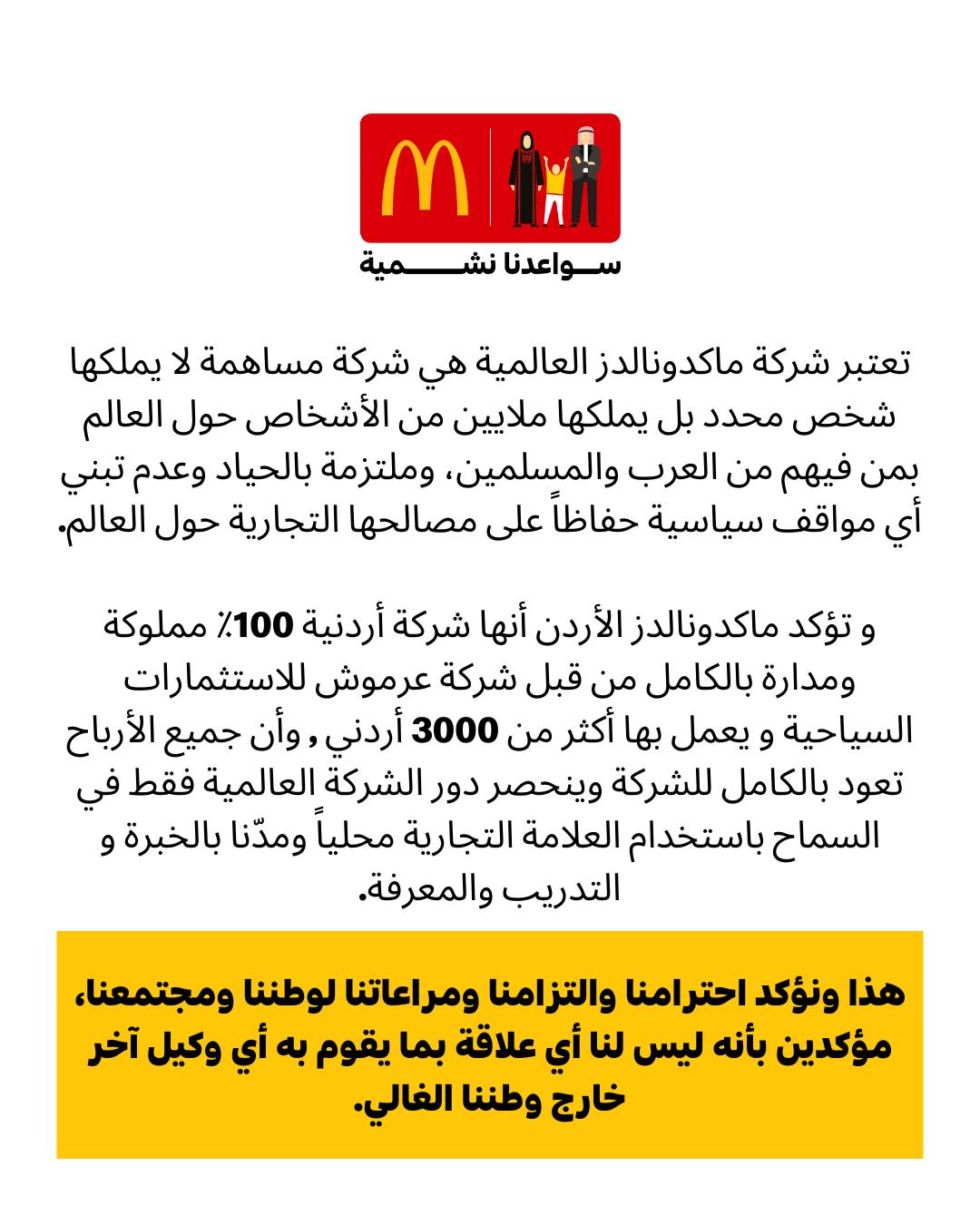 وأضافت، "يعمل في شركة ماكدونالدز الأردن أكثر من 3 آلاف مواطن أردني، وأن جميع الأرباح تعود بالكامل للشركة وينحصر دور الشركة العالمية فقط في السماح باستخدام العلامة التجارية محليًا ومدّنا بالخبرة والتدريب والمعرفة".
