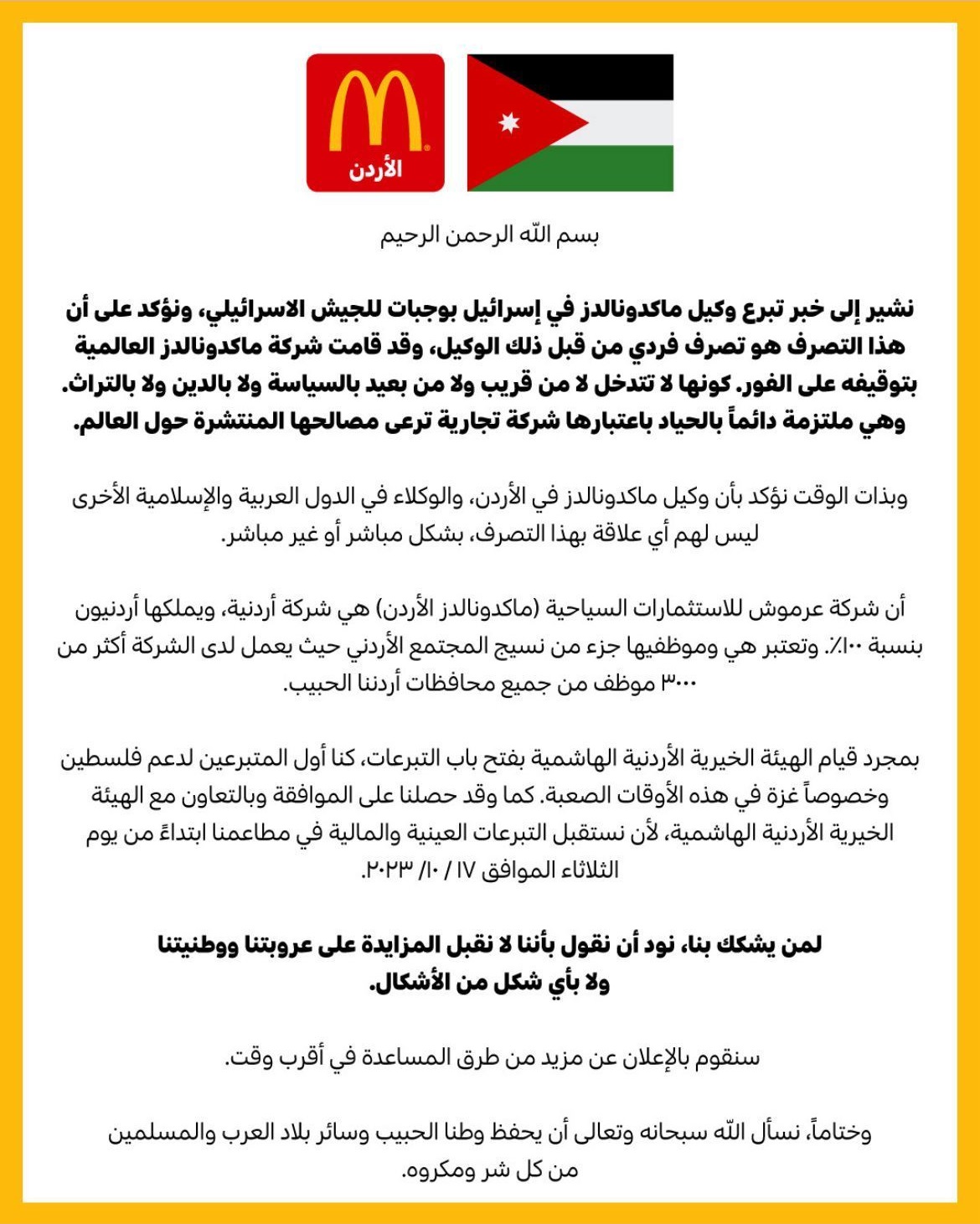نشير إلى خبر تبرع وكيل ماكدونالدز في إسرائيل بوجبات للجيش الاسرائيلي، ونؤكد على أن هذا التصرف هو تصرف فردي من قبل ذلك الوكيل، وقد قامت شركة ماكدونالدز العالمية بتوقيفه على الفور. كونها لا تتدخل لا من قريب ولا من بعيد بالسياسة ولا بالدين ولا بالتراث.