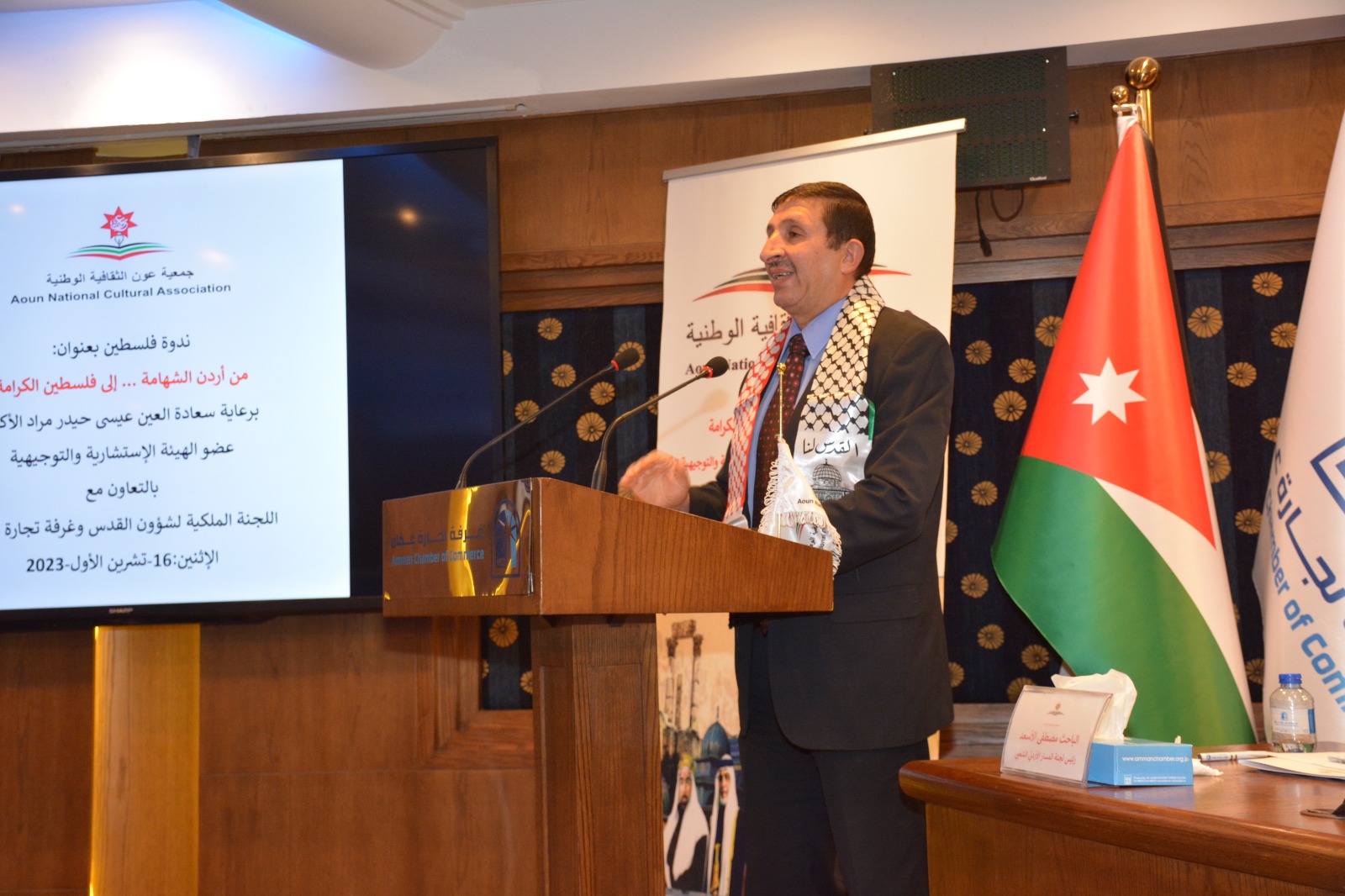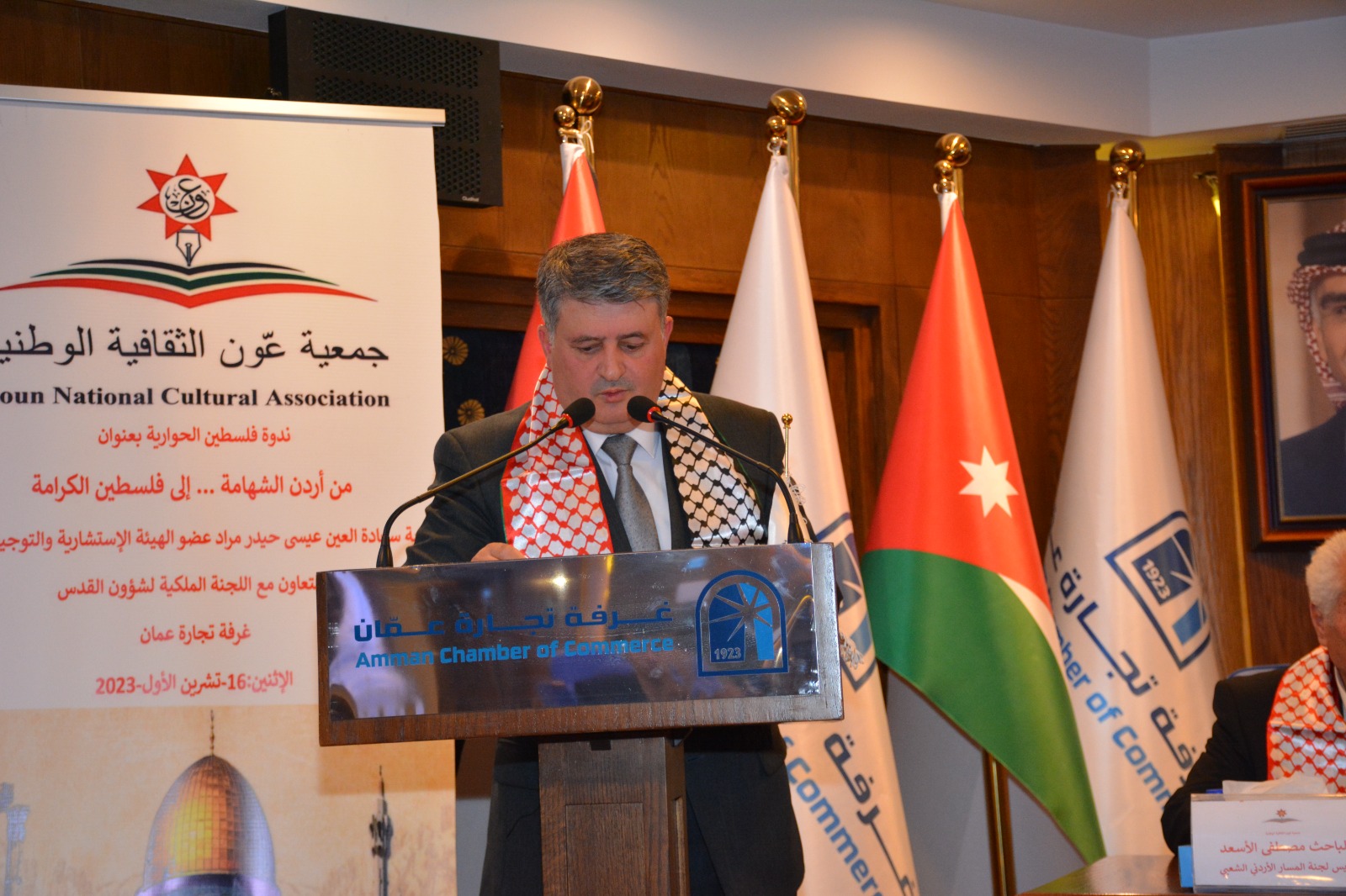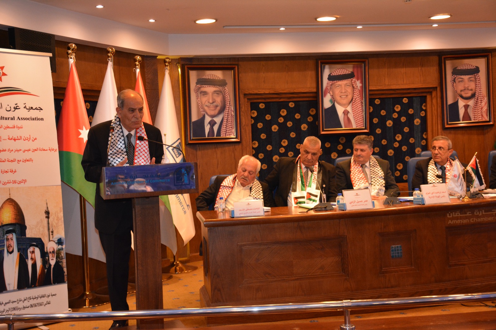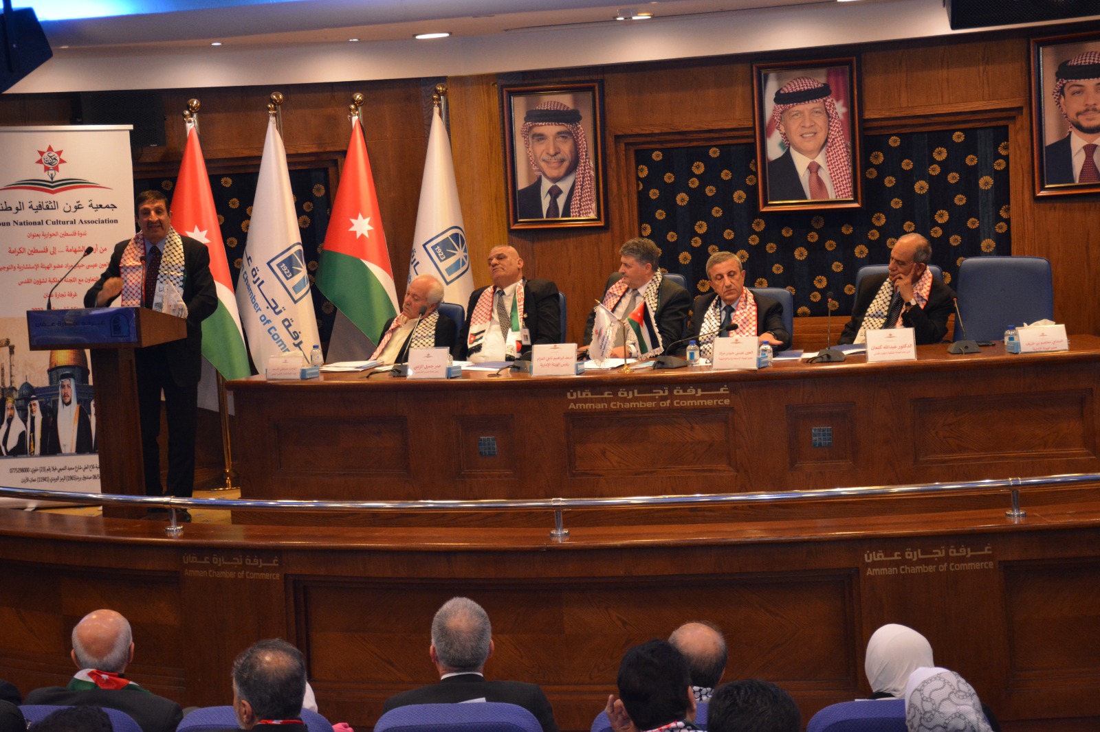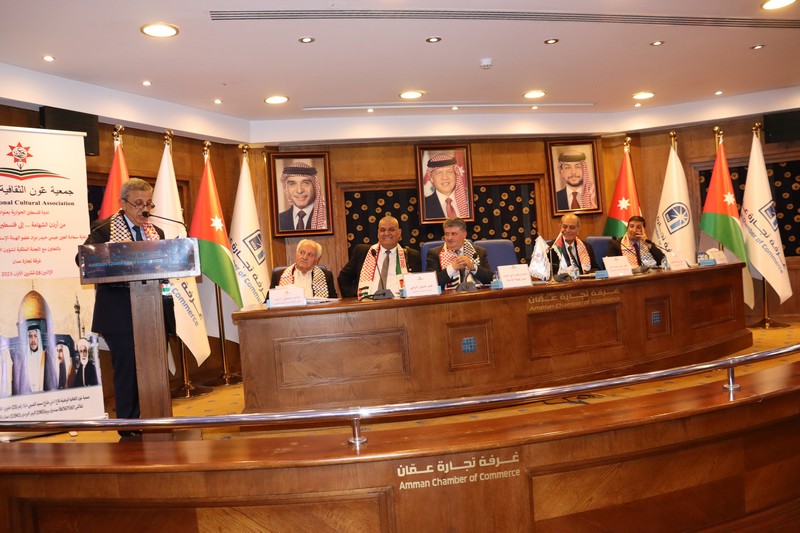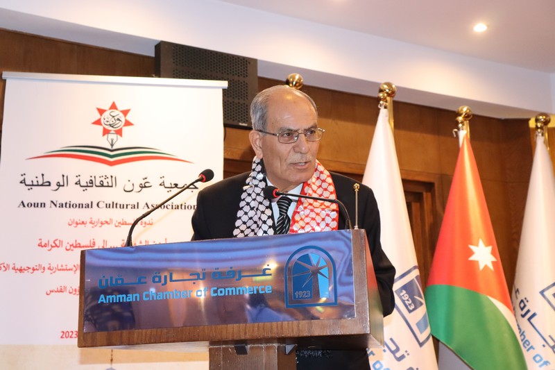 عمون - عقدت جمعية عَون الثقافية الوطنية برعاية العين عيسى حيدر مراد عضو الهيئة الإستشارية والتوجيهية بالتعاون مع اللجنة الملكية لشؤون القدس وغرفة تجارة عمان ندوة عن فلسطين بعنوان "من أردن الشهامة ... إلى فلسطين الكرامة"
