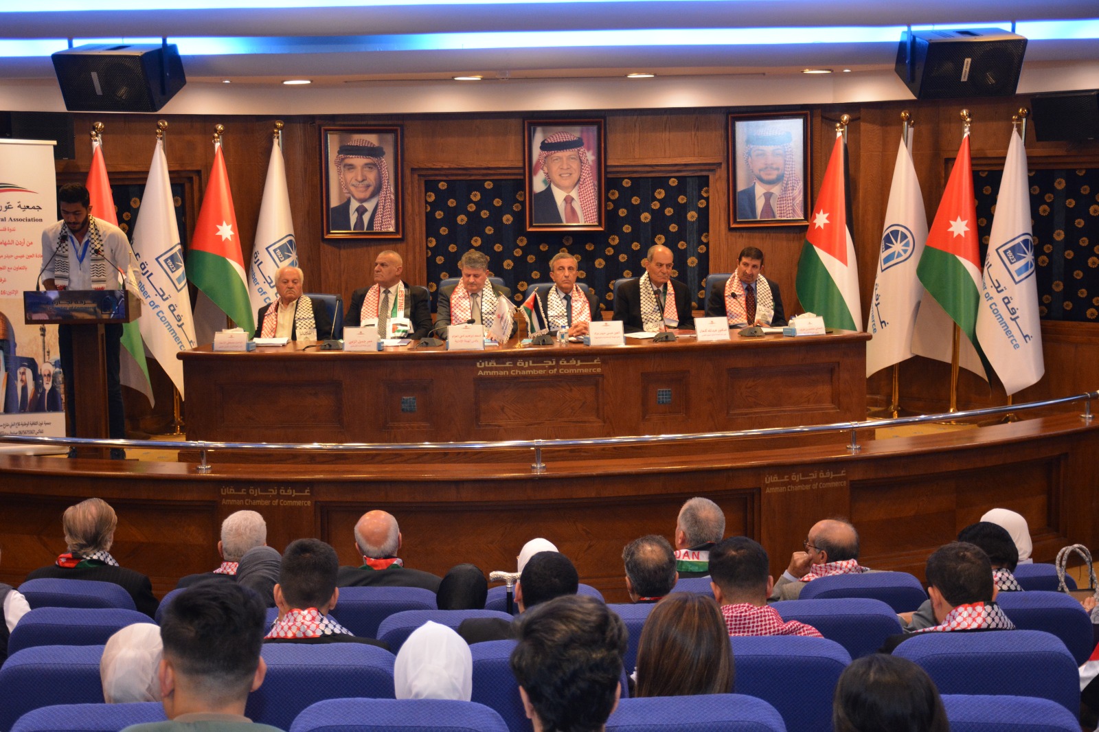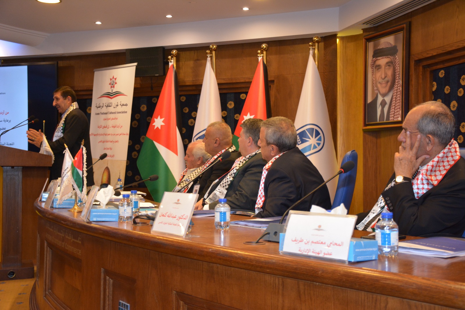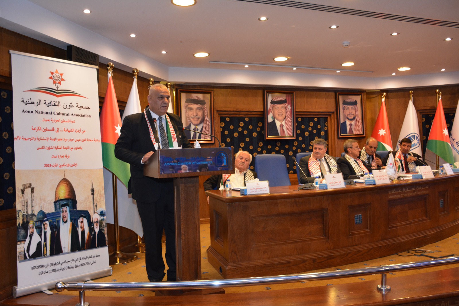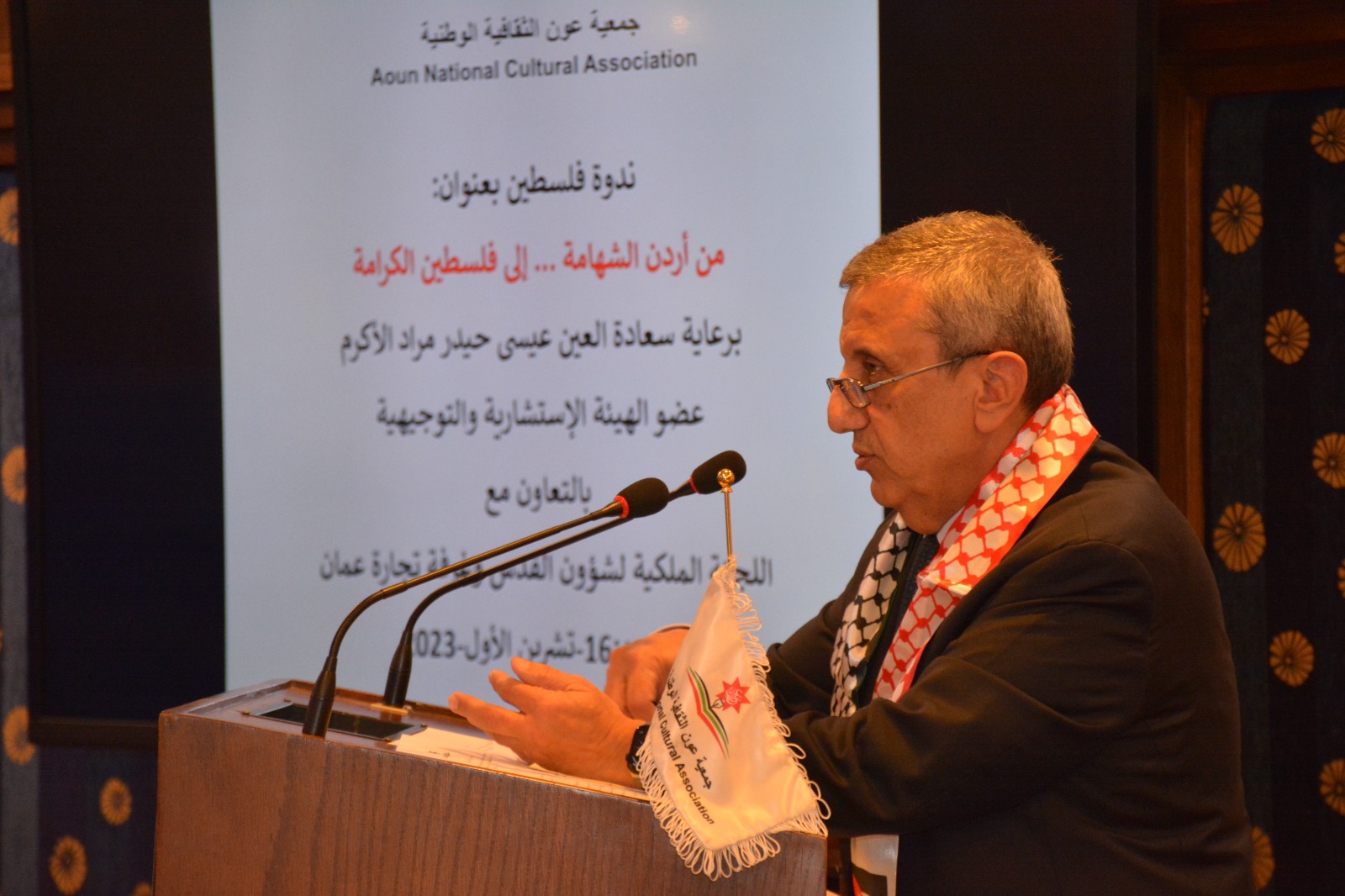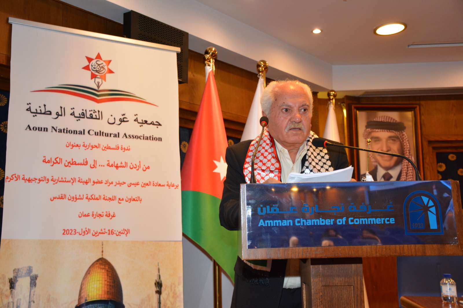 عمون - عقدت جمعية عَون الثقافية الوطنية برعاية العين عيسى حيدر مراد عضو الهيئة الإستشارية والتوجيهية بالتعاون مع اللجنة الملكية لشؤون القدس وغرفة تجارة عمان ندوة عن فلسطين بعنوان "من أردن الشهامة ... إلى فلسطين الكرامة"