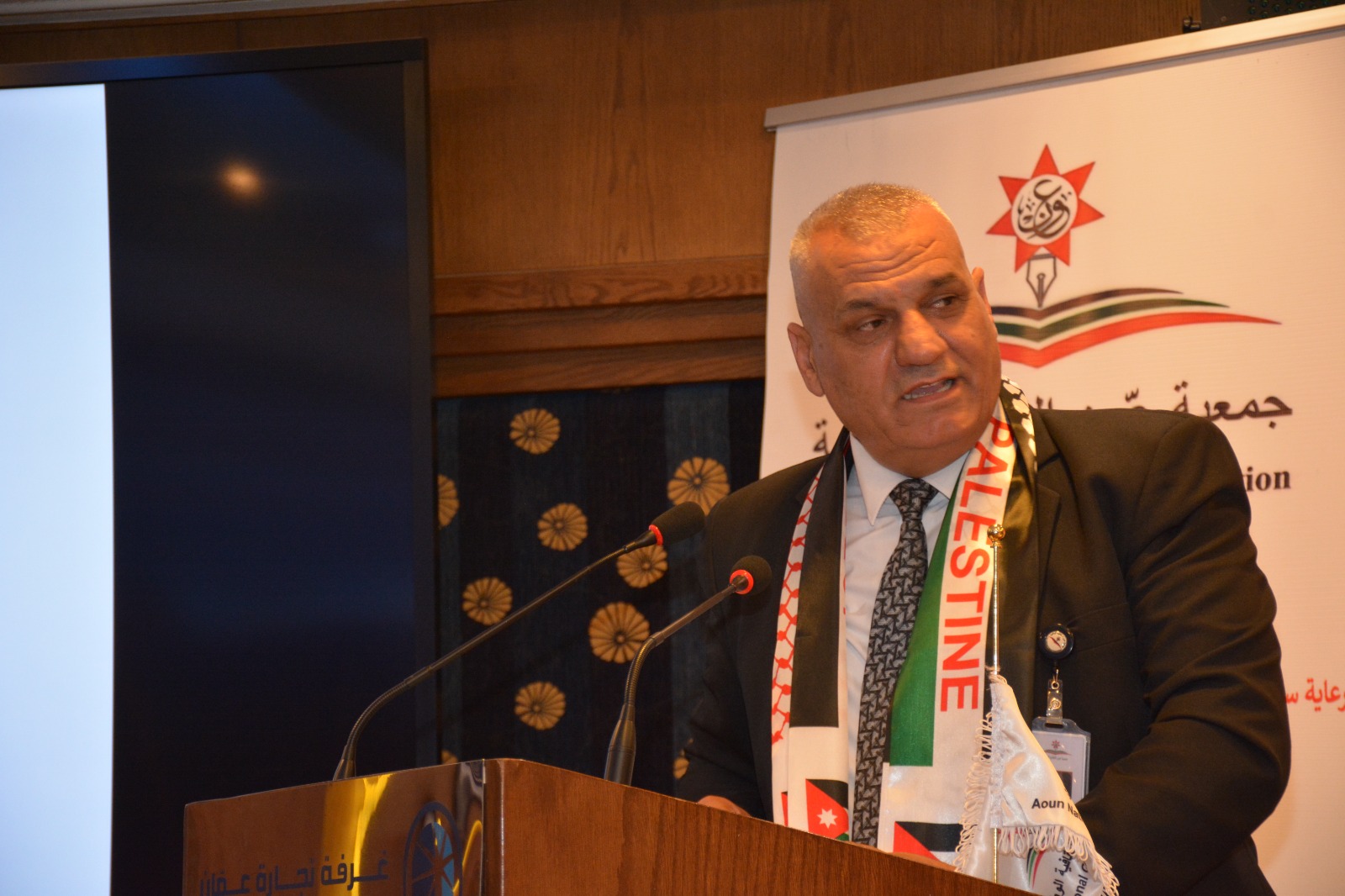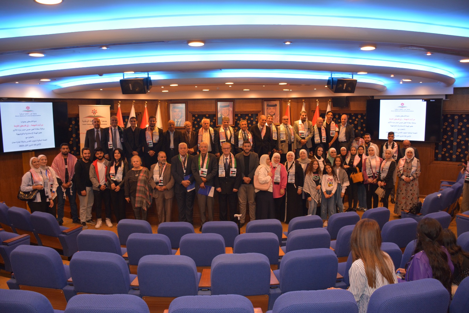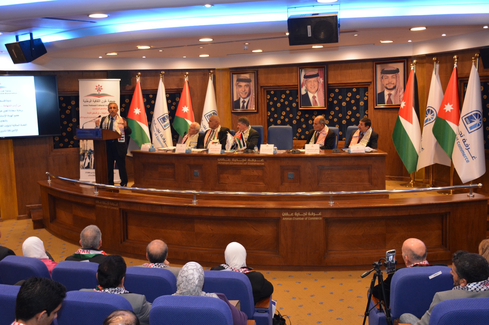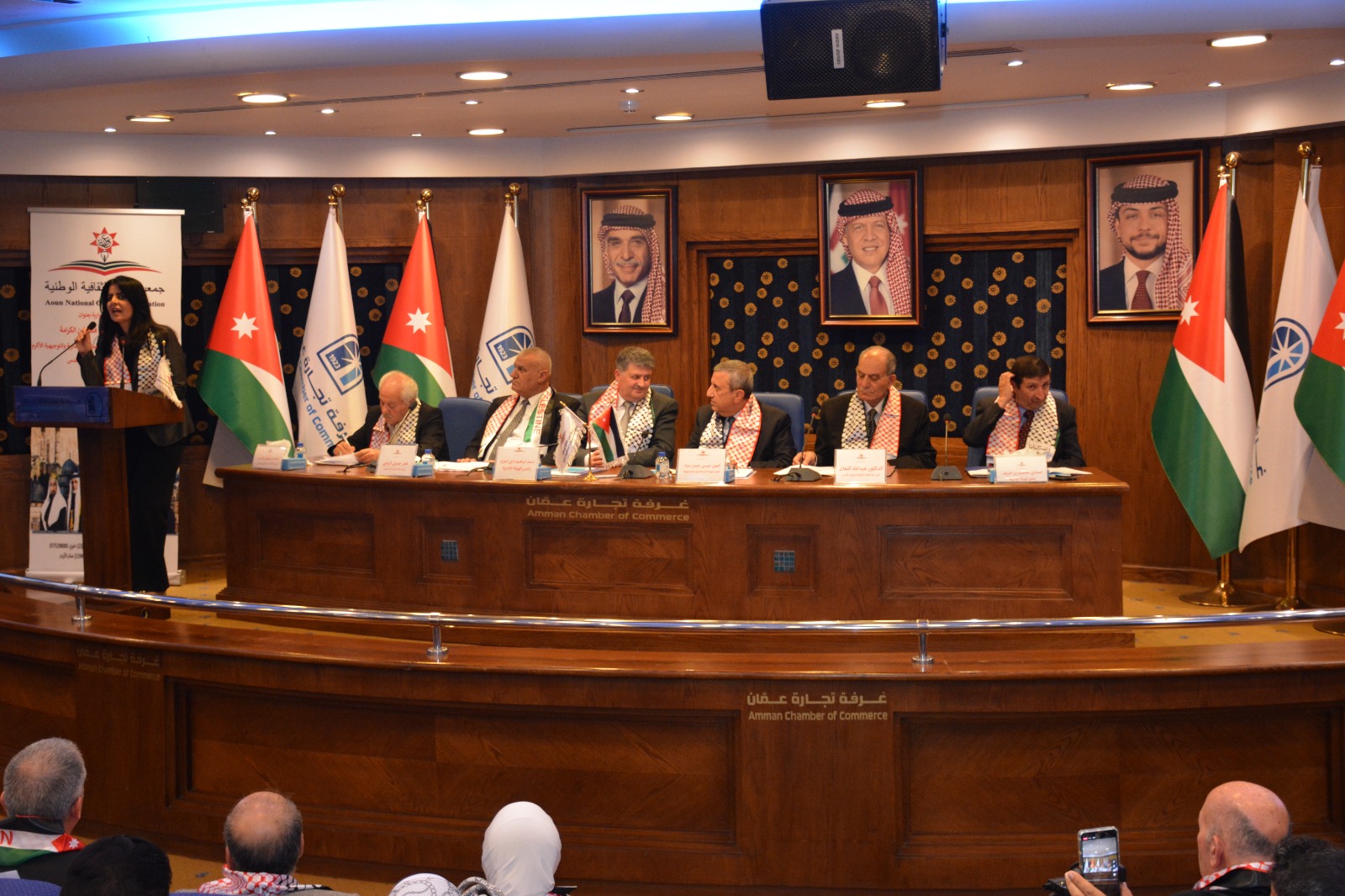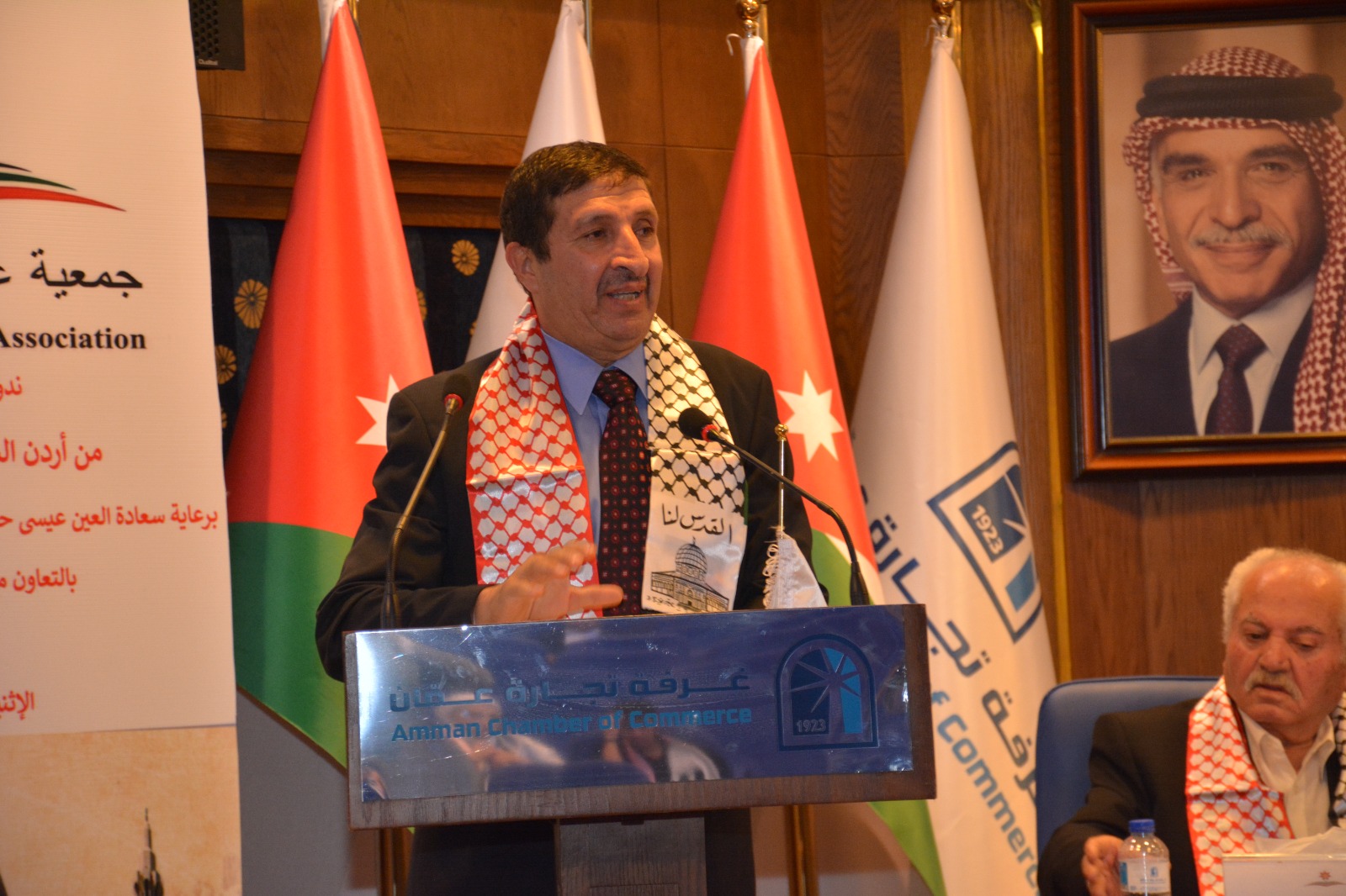 عمون - عقدت جمعية عَون الثقافية الوطنية برعاية العين عيسى حيدر مراد عضو الهيئة الإستشارية والتوجيهية بالتعاون مع اللجنة الملكية لشؤون القدس وغرفة تجارة عمان ندوة عن فلسطين بعنوان "من أردن الشهامة ... إلى فلسطين الكرامة"