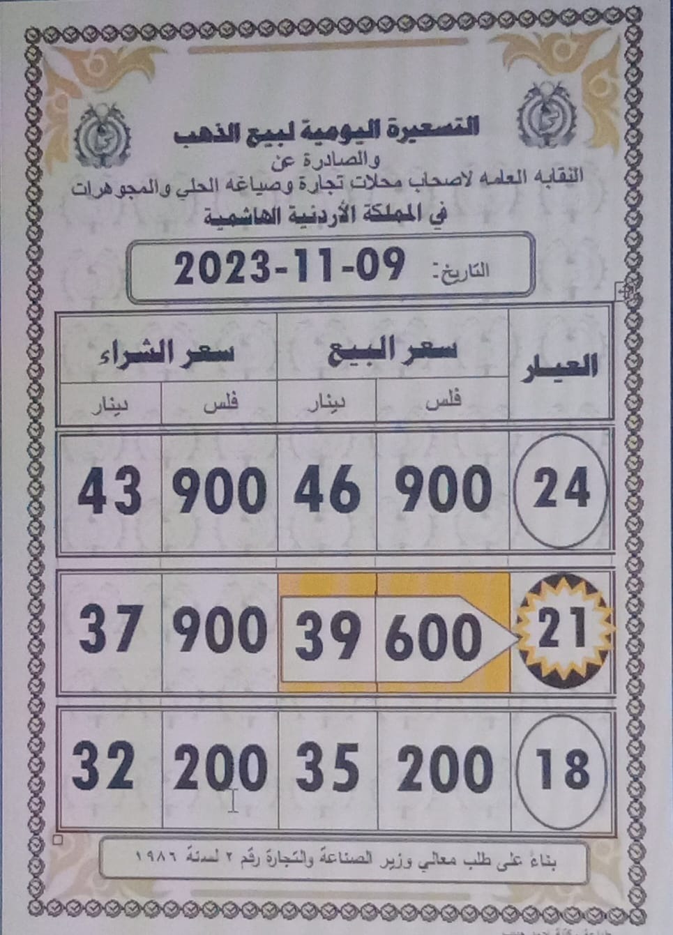 عمون - انخفضت أسعار الذهب في السوق المحلي الأردني اليوم الخميس 20 قرشا، وفق التسعيرة الصادرة عن النقابة العامة لاصحاب محلات تجارة وصياغة الحلي والمجوهرات. |