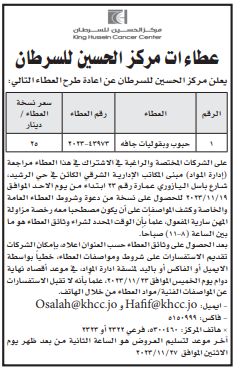 مطلوب توريد حبوب وبقوليات جافة لمركز الحسين للسرطان