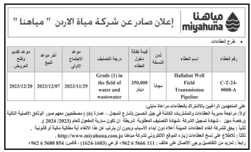 عطاء صادر عن شركة مياه الاردن "مياهنا"