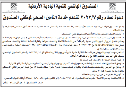 مطلوب تقديم خدمات التأمين الصحي لموظفي الصندوق الهاشمي لتنمية البادية الشمالية