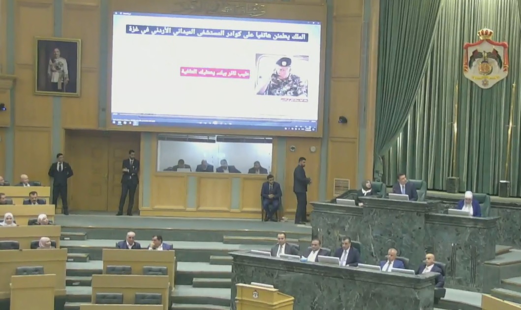عمون - عرض مجلس النواب عبر شاشاته تحت قبة البرلمان، الاتصال الذي أجراه جلالة الملك عبدالله الثاني مع قائد قوة المستشفى الميداني الأردني في قطاع غزة العقيد ثائر الخطيب.