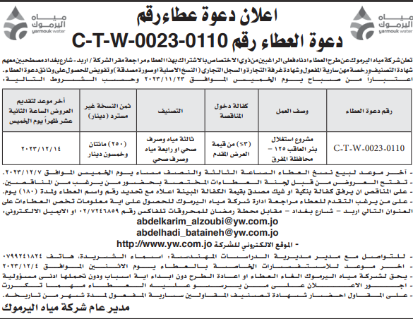 عطاء صادر عن شركة مياه اليرموك