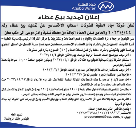 عطاء صادر عن شركة مياه العقبة