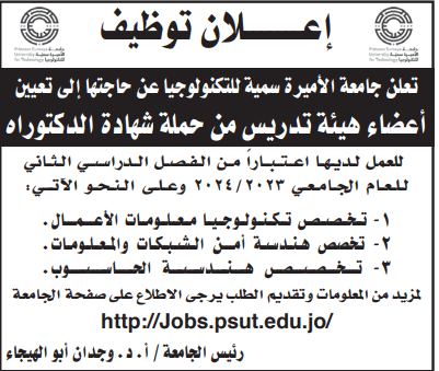 جامعة الاميرة سمية للتكنولوجيا بحاجة لتعيين أعضاء هيئة تدريسية