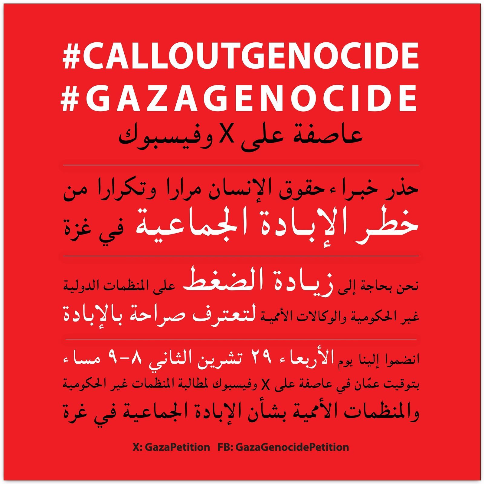 عمون - دعا نشطاء الى المشاركة في عاصفة إلكترونية عبر منصتي X و الفيسبوك ، وذلك للضغط على المنظمات الدولية غير الحكومية والوكالات الاممية لتعترف صراحة بالابادة الجماعية في قطاع غزة ، وذلك مساء اليوم الاربعاء 29 تشرين الثاني من الساعة 8 ولغاية 9 مساء بتوقيت عمان . |