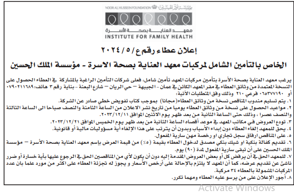 مطلوب التأمين الشامل لمركبات معهد العناية بصحة الاسرة