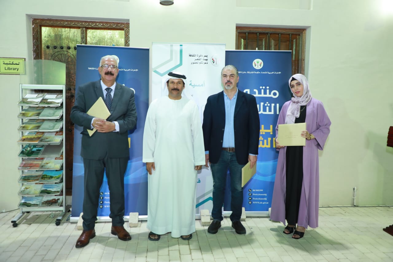 عمون - ضمن فعاليات منتدى الثلاثاء، نظم بيت الشعر بدائرة الثقافة في الشارقة أمسية شعرية يوم الثلاثاء الموافق 5 ديسمبر 2023، شارك فيها الشاعران: يوسف عبدالعزيز من الأردن، ومحمد علي الخضور من سوريا، بحضور الشاعر محمد عبدالله البريكي مدير البيت.