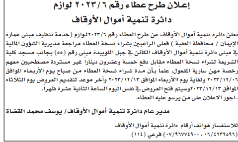مطلوب توفير خدمة التنظيف لدائرة تنمية اموال الزكاة