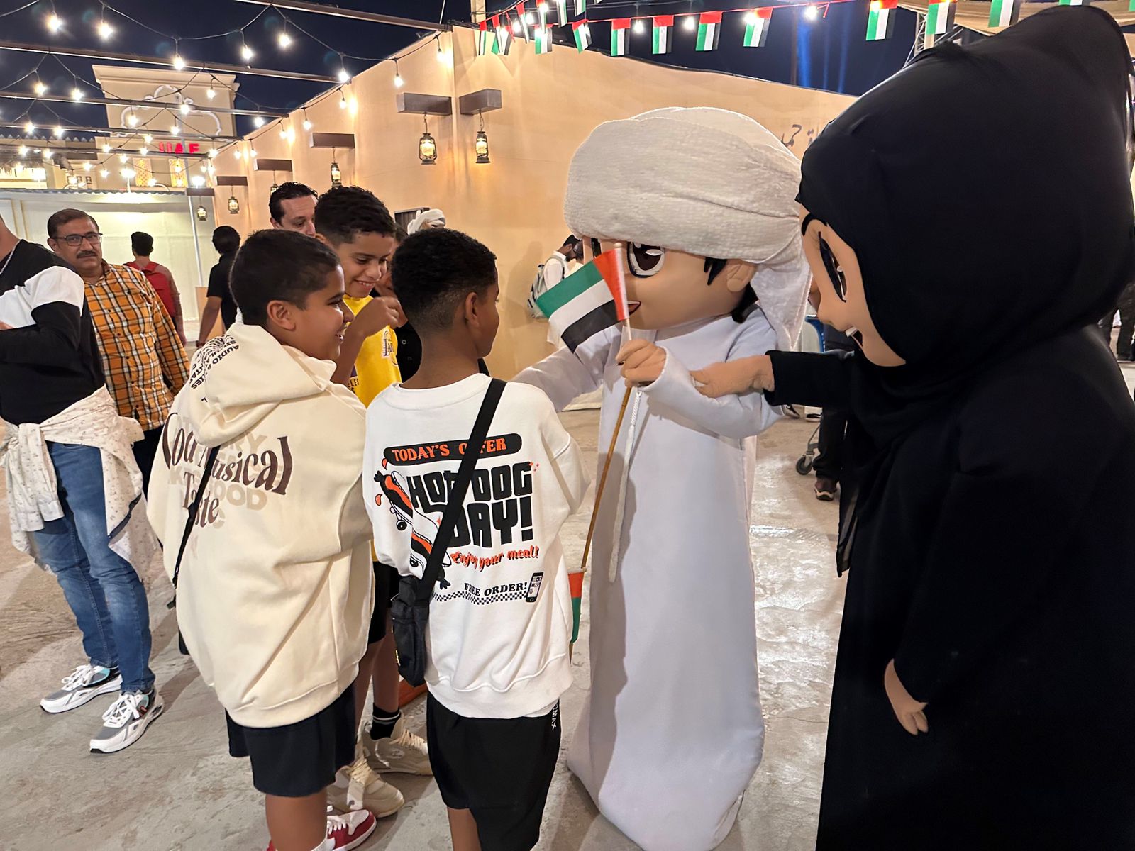 وعلى غرار احتفالاته الوطنية، تواجد كل من شخصيتي "عمير" و"غبيشة"، بمناسبة اليوم الوطني الـ 52، اللذان تجولا بين زوار القرية ووزعا عليهم رايات الوطن وشعاراته، الأمر الذي أضفى على المكان المزيد من التفاعل والفرح خاصة بين الأطفال.