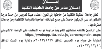 جامعة الطفيلة التقنية بحاجة لتعيين اعضاء هيئة تدريسية