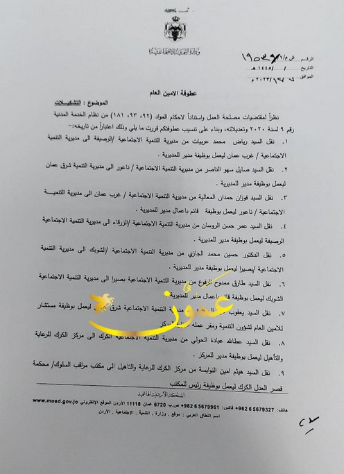 عمون - ينال المعاني - قررت وزير التنمية الاجتماعية وفاء بني مصطفى اجراء تشكيلات ادارية لكبار الموظفين في مديريات الوزارة. |