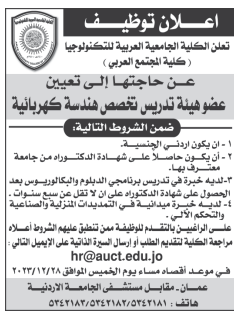 ترغب الكلية الجامعية العربية للتكنولوجيا تعيين عضو هيئة تدريس