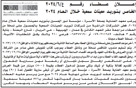 عطاء صادر عن معهد العناية بصحة الاسرة