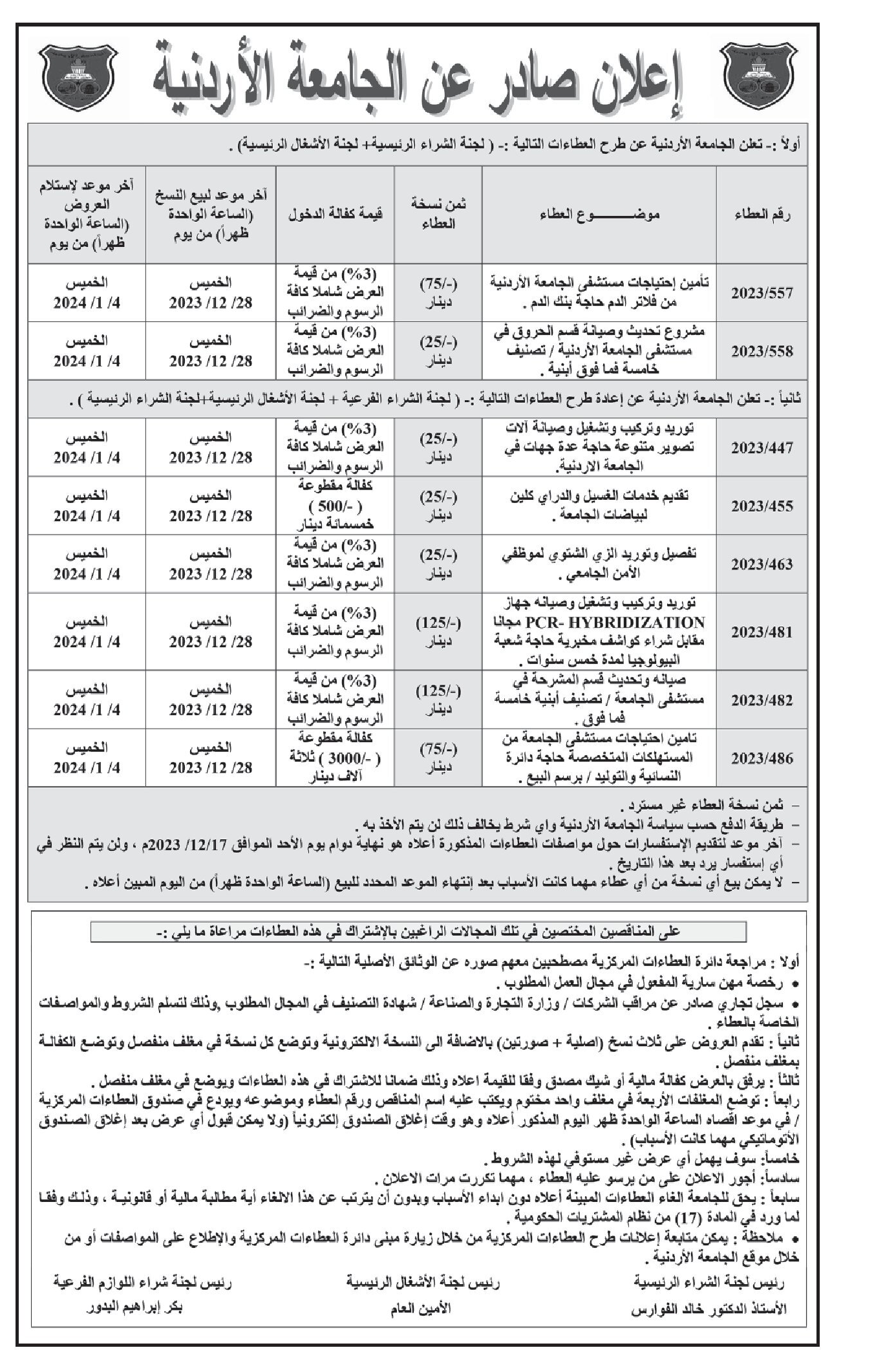 عطاءات صادرة عن الجامعة الأردنية