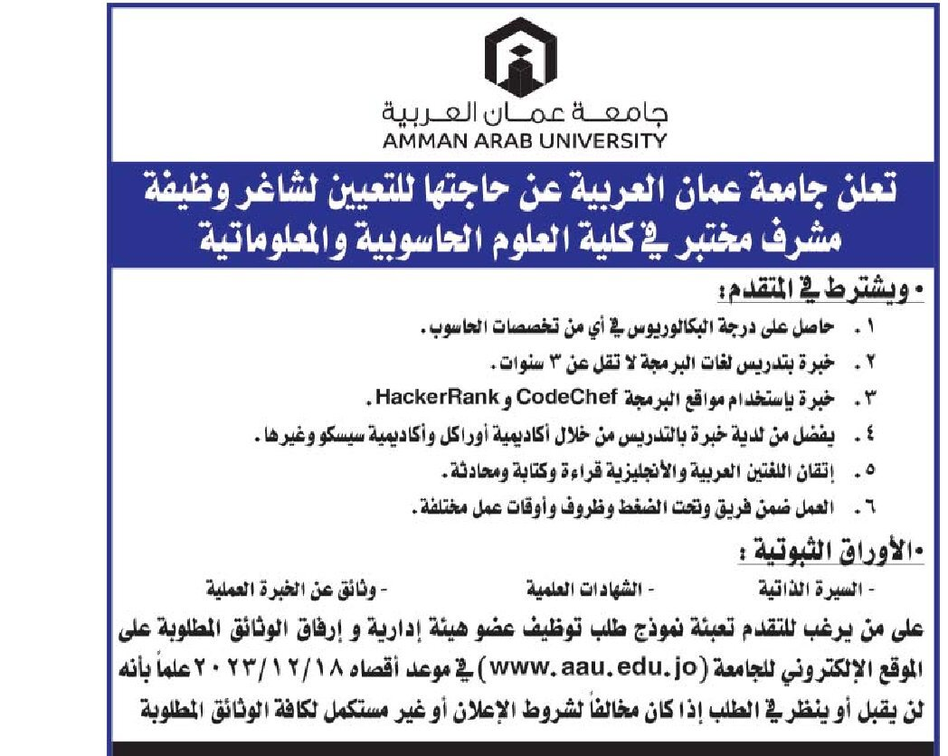 شاغر "مشرف مختبر" في جامعة عمّان العربية