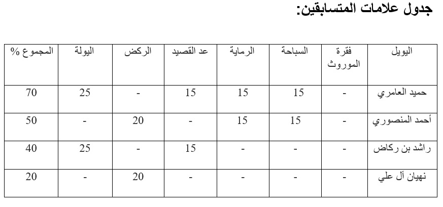 وحقق حميد العامري من أبوظبي المركز الأول برصيد 70 علامة، ورافقه في التأهل أحمد المنصوري من دبي برصيد 50 علامة، فيما جاء بالمركز الثالث راشد بن ركاض من أم القيوين برصيد 40 علامة، وبالمركز الرابع نهيان آل علي من العين برصيد 20 نقطة.