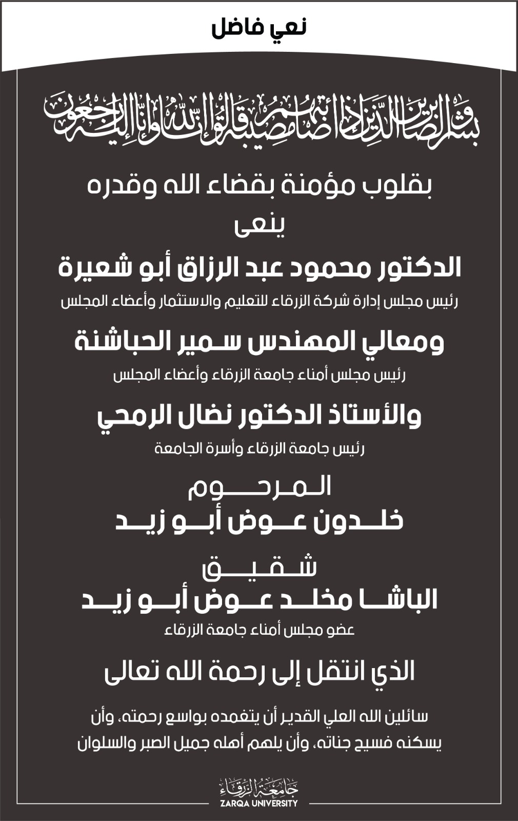 عمون - بقلوب مؤمنة بقضاء الله وقدره ينعى الدكتور محمود عبد الرزاق أبو شعيرة رئيس مجلس إدارة شركة الزرقاء للتعليم والاستثمار وأعضاء المجلس ومعالي المهندس سمير الحباشنة رئيس مجلس أمناء جامعة الزرقاء وأعضاء المجلس والأستاذ الدكتور نضال الرمحي رئيس جامعة الزرقاء وأسرة الجامعة، المرحوم خلدون عوض أبو زيد شقيق الباشا مخلد عوض أبو زيد عضو مجلس أمناء جامعة الزرقاء الذي انتقل إلى رحمة الله تعالى. |